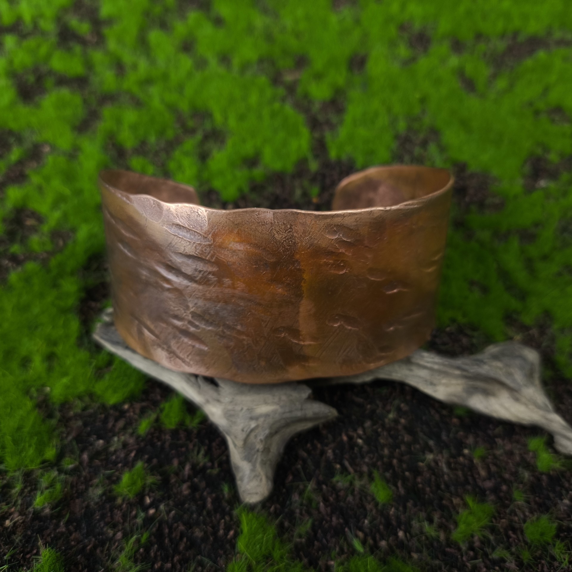 Bransoleta miedziana. Ręcznie robiona z miedzi. Otwarta, przez co można wyregulować ją do własnego nadgarstka. Szerokość ok. 4cm.