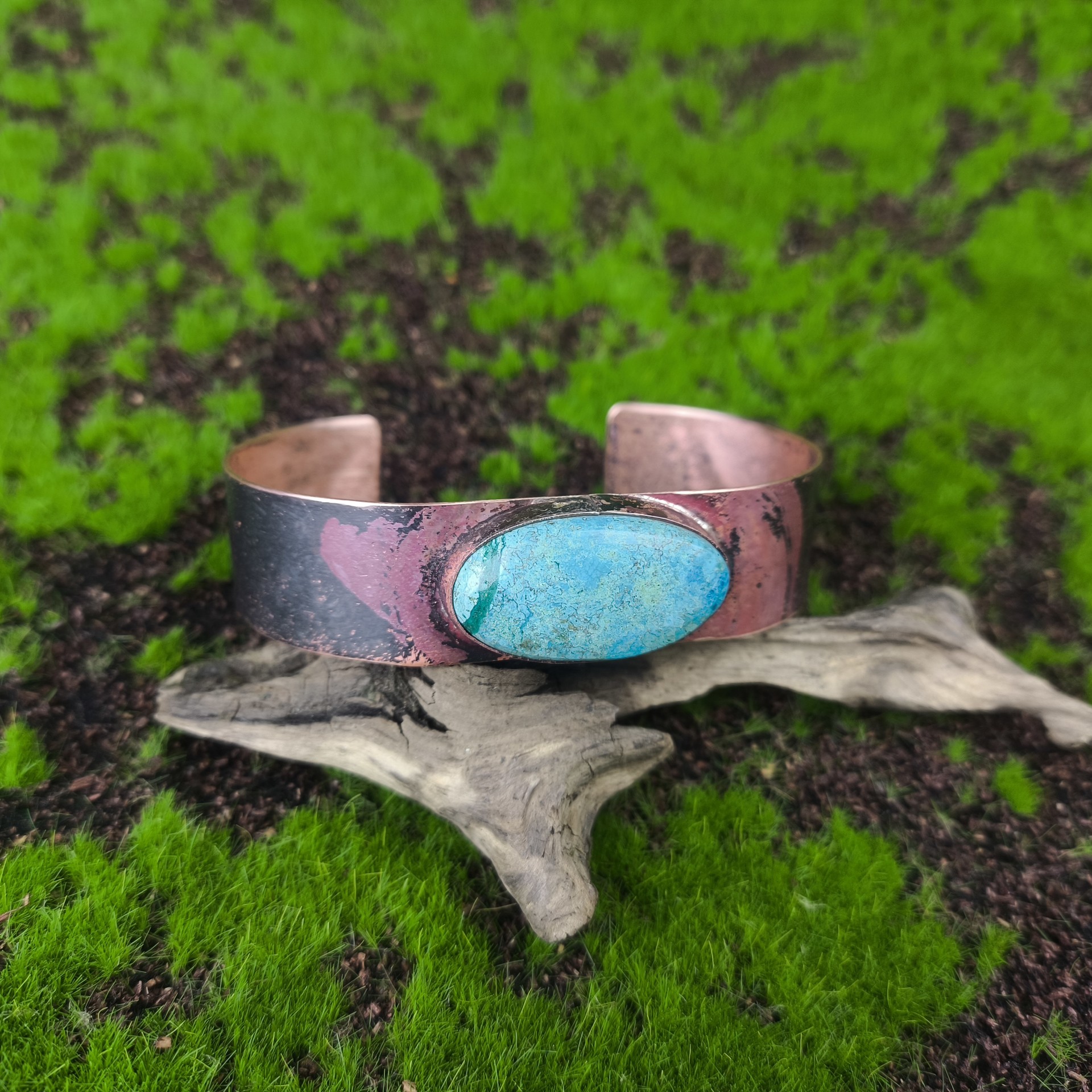 Bransoleta miedziana z Chryzokolą. Ręcznie robiona z miedzi. Otwarta, przez co można wyregulować ją do własnego nadgarstka. Szerokość ok. 1,8cm. Raczej na mniejsze nadgarstki.