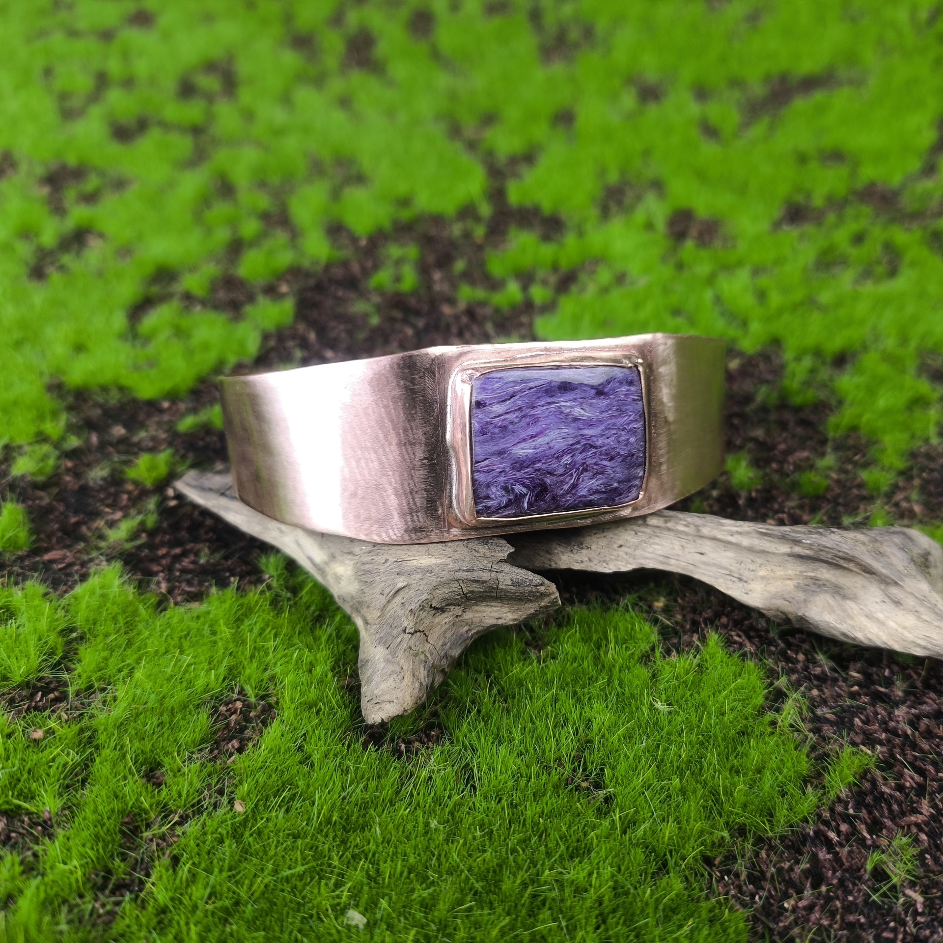 Bransoleta miedziana z Czaroitem. Ręcznie robiona z miedzi. Otwarta, przez co można wyregulować ją do własnego nadgarstka. Ciekawy kształt. Szerokość ok. 2cm. Raczej na mniejsze nadgarstki.