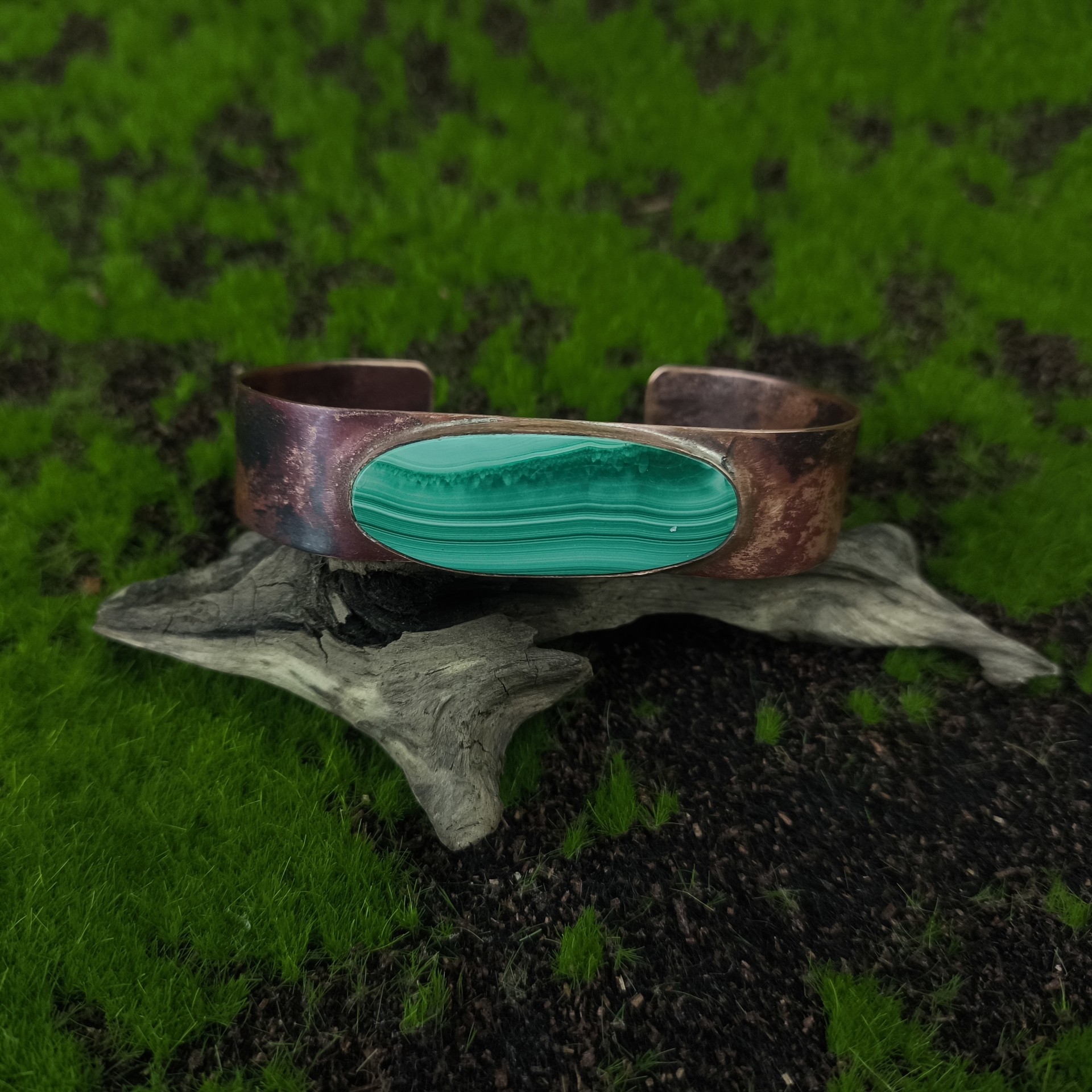 Bransoleta miedziana z Malachitem. Ręcznie robiona z miedzi. Otwarta, przez co można wyregulować ją do własnego nadgarstka. Szerokość ok. 1,5cm. Raczej na mniejsze nadgarstki.