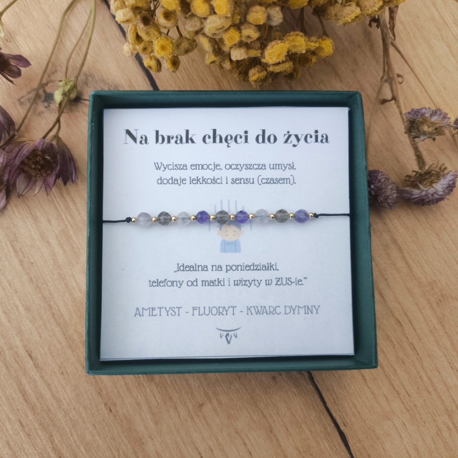 Bransoletka stworzona z Ametystu, Fluorytu i Kwarcu Dymnego. Ametyst łagodzi niepokój, Kwarc Dymny neutralizuje negatywne energie i stabilizuje emocje, a Fluoryt wspiera jasność umysłu. Zestaw na mentalny detoks.