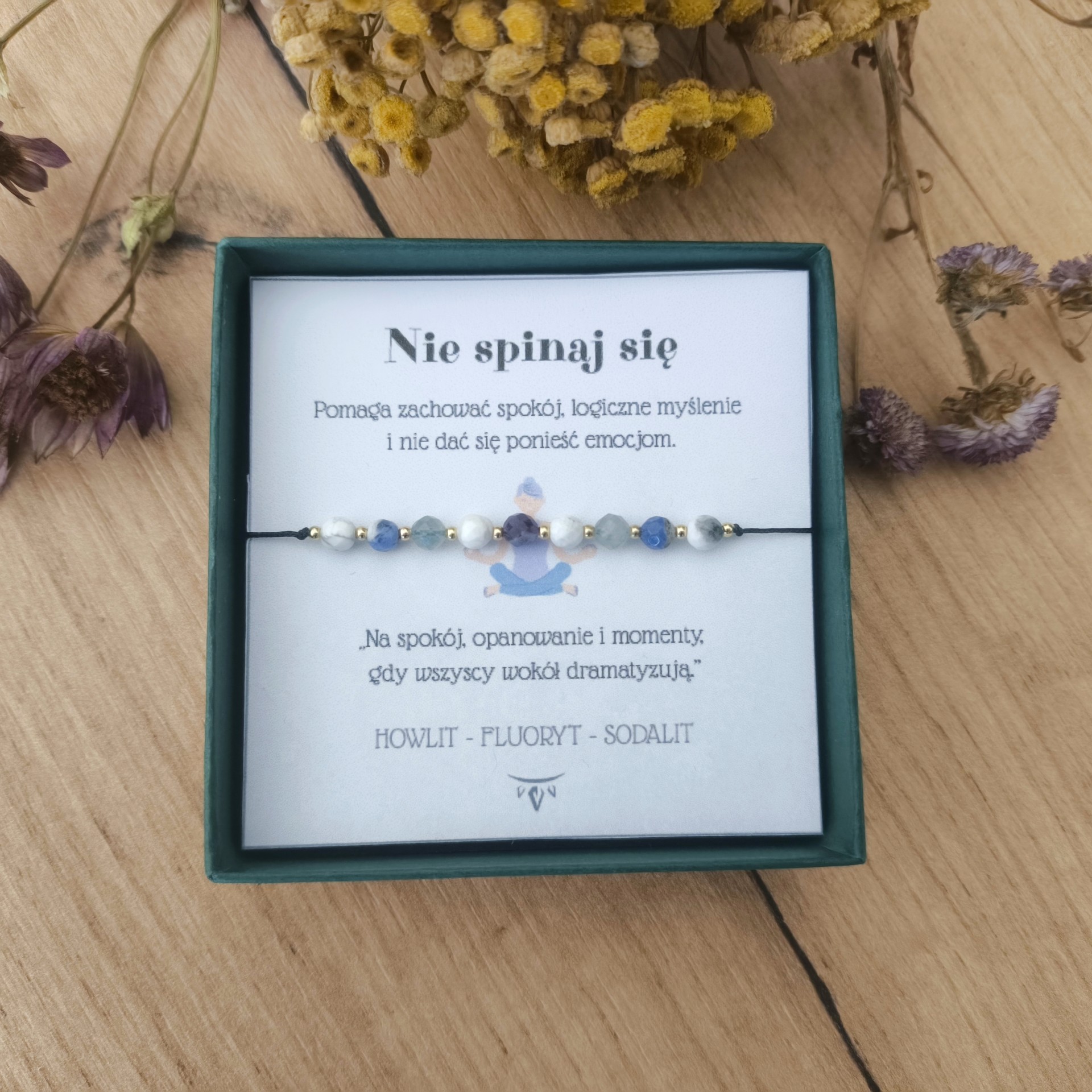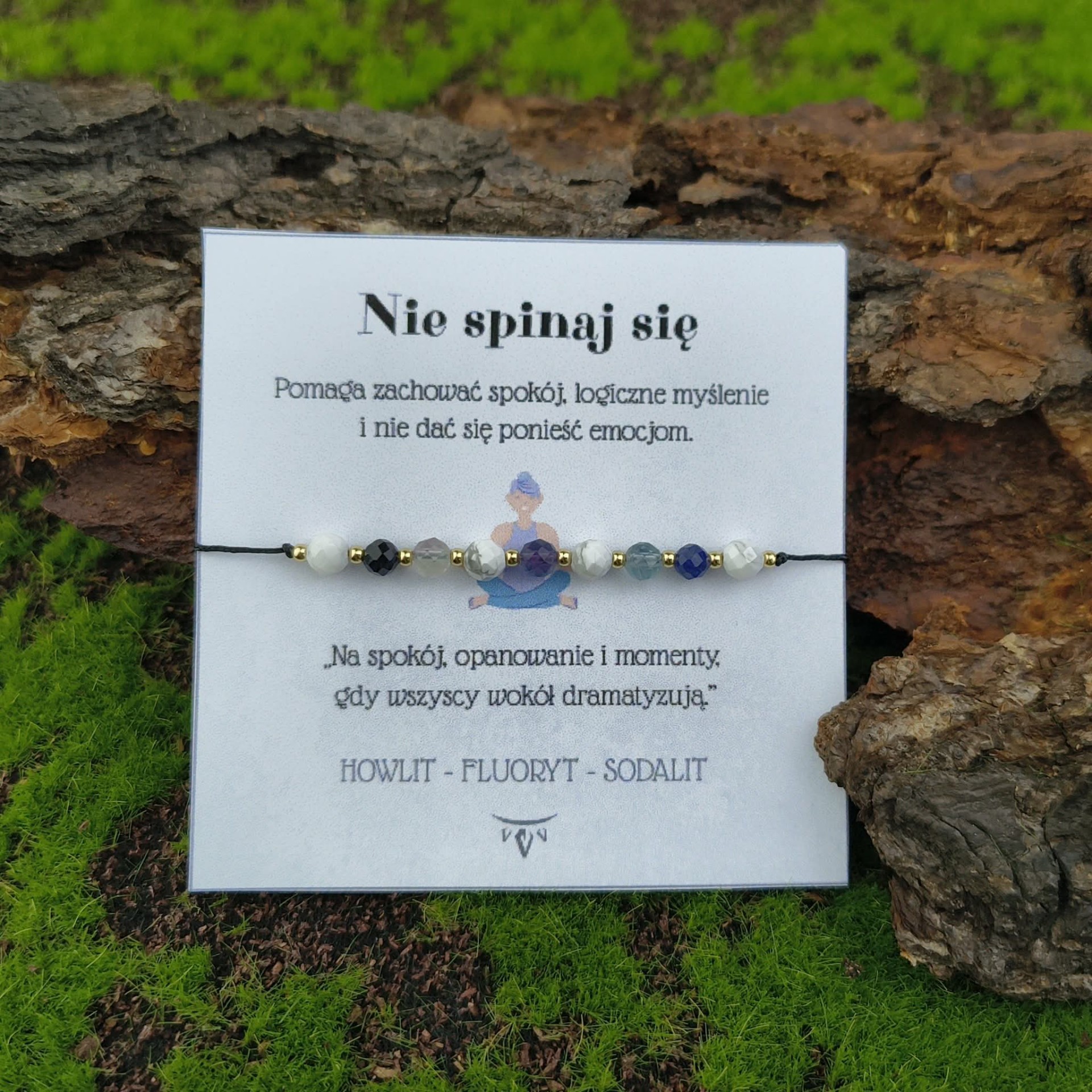Bransoletka stworzona z Howlitu, Fluorytu i Sodalitu. Howlit koi nerwy i wzmacnia równowagę psychiczną. Sodalit wspiera logiczne myślenie i komunikację. Fluoryt zapewnia jasność umysłu i harmonię.