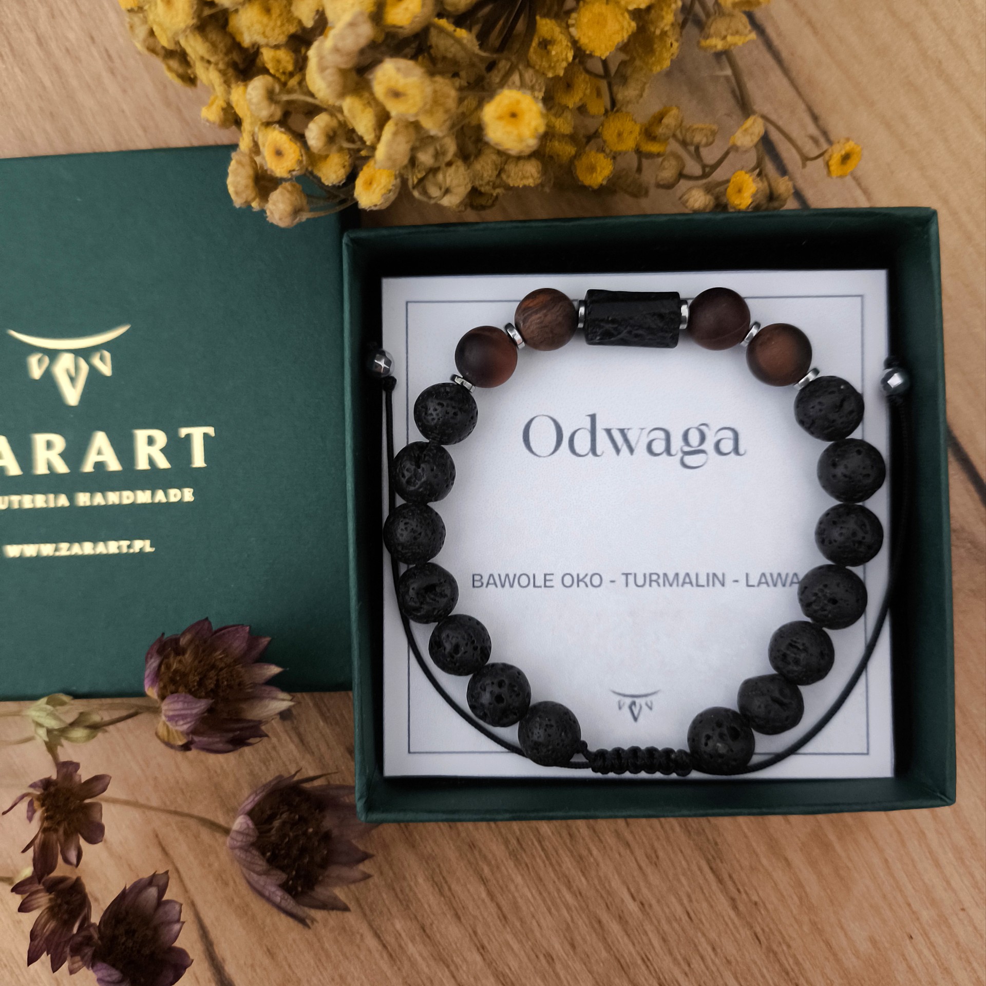Istnieje możliwość wymiany lawy wulkanicznej na matowe kulki Onyksu lub polerowane kulki Turmalinu oraz dodania lub odjęcia kamieni - jeśli zajdzie taka potrzeba, aby lepiej dopasowaćdo swojej ręki.