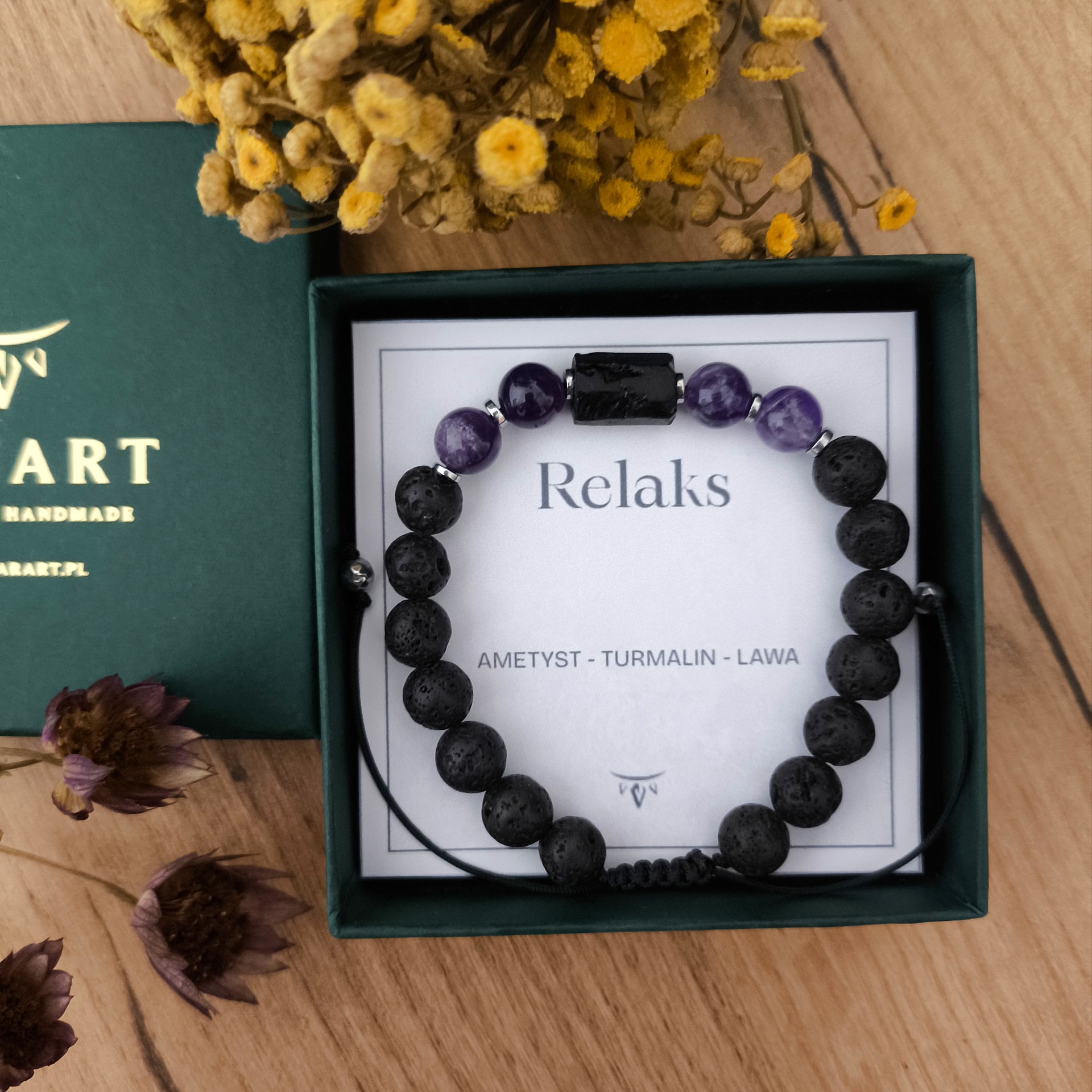 Bransoletka "Relaks" - stworzona z kamieni: Ametyst, Turmalin, Lawa wulkaniczna. Bransoletka regulowana od rozmiaru ok. 17 do ok 21.