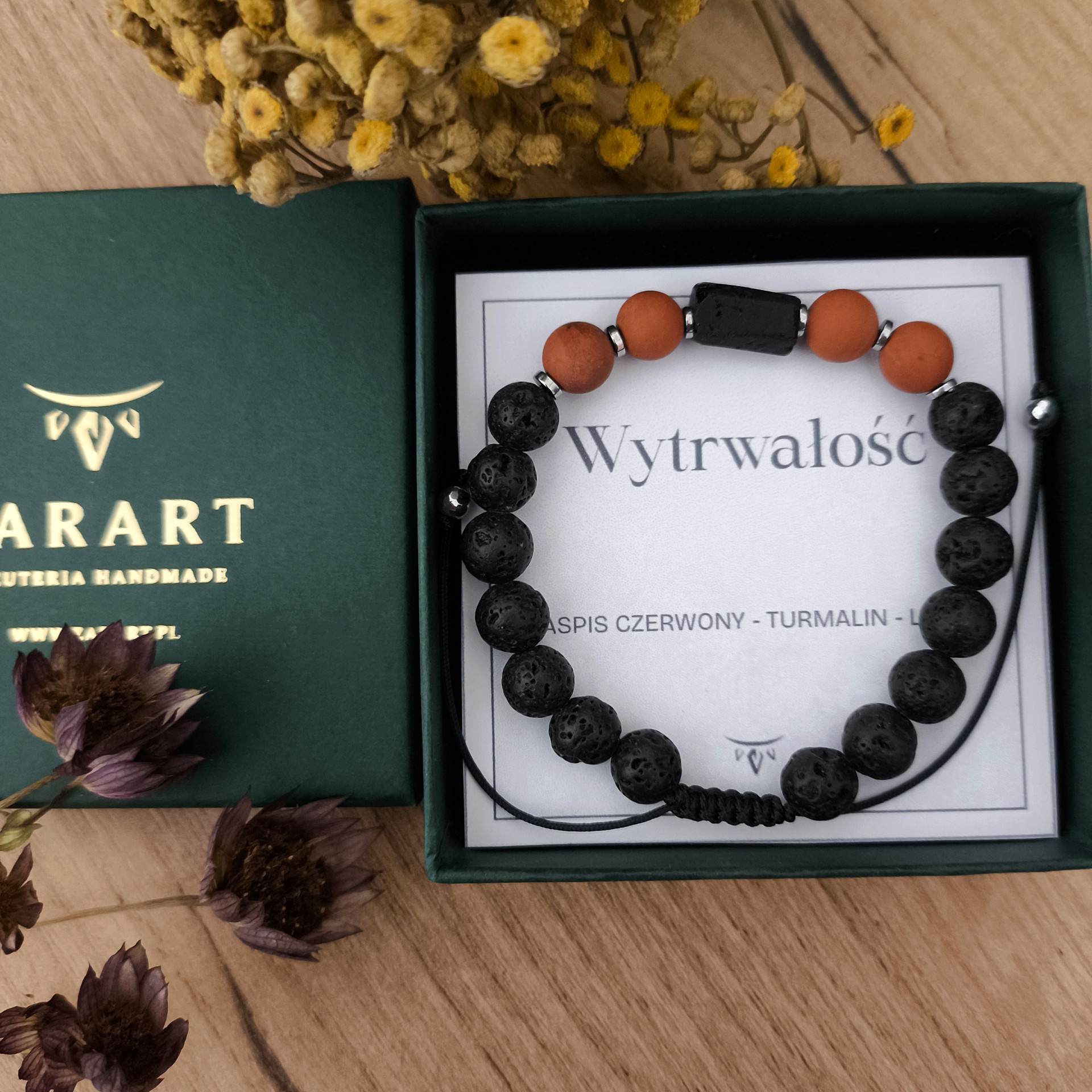 Bransoletka "Wytrwałość" - stworzona z kamieni: Jaspis czerwony, Turmalin, Lawa wulkaniczna. Bransoletka regulowana od rozmiaru ok. 17 do ok 21.