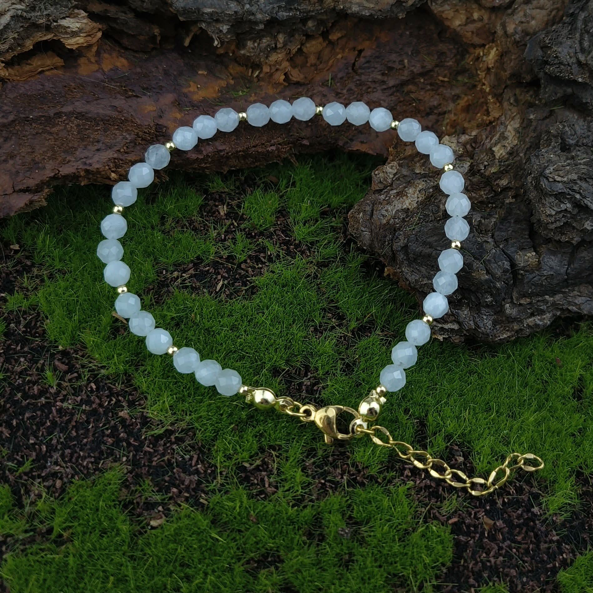 Bransoletka z Akwamarynem na lince stalowej jubilerskiej. Zapięcie oraz inne elementy metalowe są ze stali szlachetnej pozłacanej. Bransoletka ma rozmiar ok 17 + 3cm przedłużki, dlatego łatwo dopasować ją do swojego nadgarstka. Kamienie o pięknej barwie.