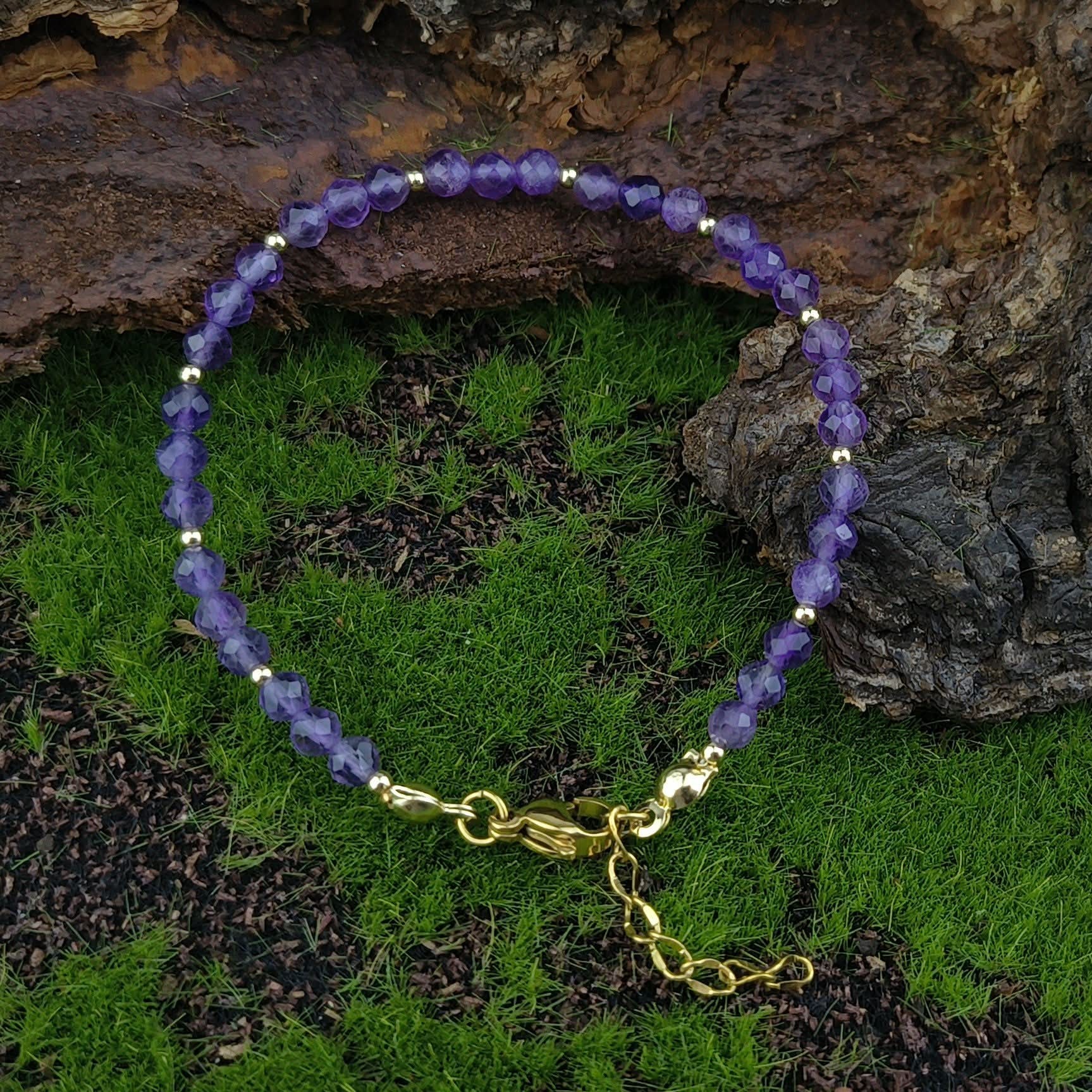 Bransoletka z Ametystem na lince stalowej jubilerskiej. Zapięcie oraz inne elementy metalowe są ze stali szlachetnej pozłacanej. Bransoletka ma rozmiar ok 17 + 3cm przedłużki, dlatego łatwo dopasować ją do swojego nadgarstka. Kamienie o pięknej barwie.