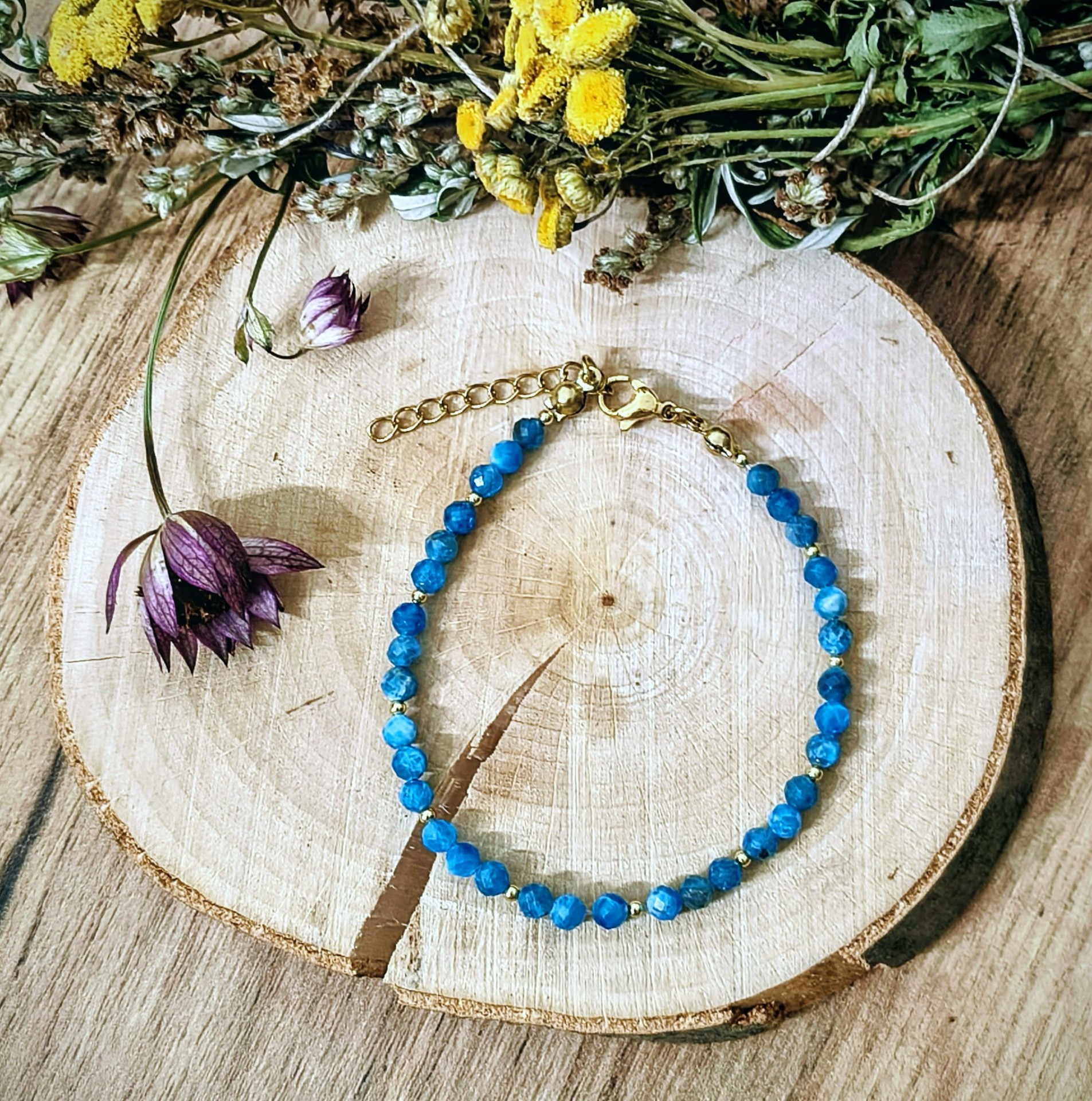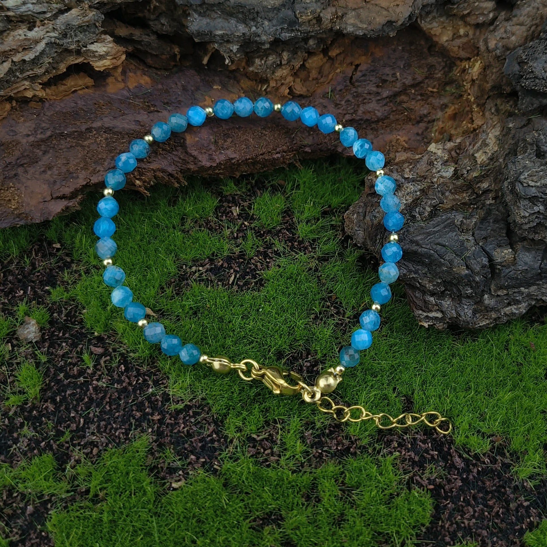 Bransoletka z Apatytem na lince stalowej jubilerskiej. Zapięcie oraz inne elementy metalowe są ze stali szlachetnej pozłacanej. Bransoletka ma rozmiar ok 17 + 3cm przedłużki, dlatego łatwo dopasować ją do swojego nadgarstka. Kamienie o pięknej barwie.
