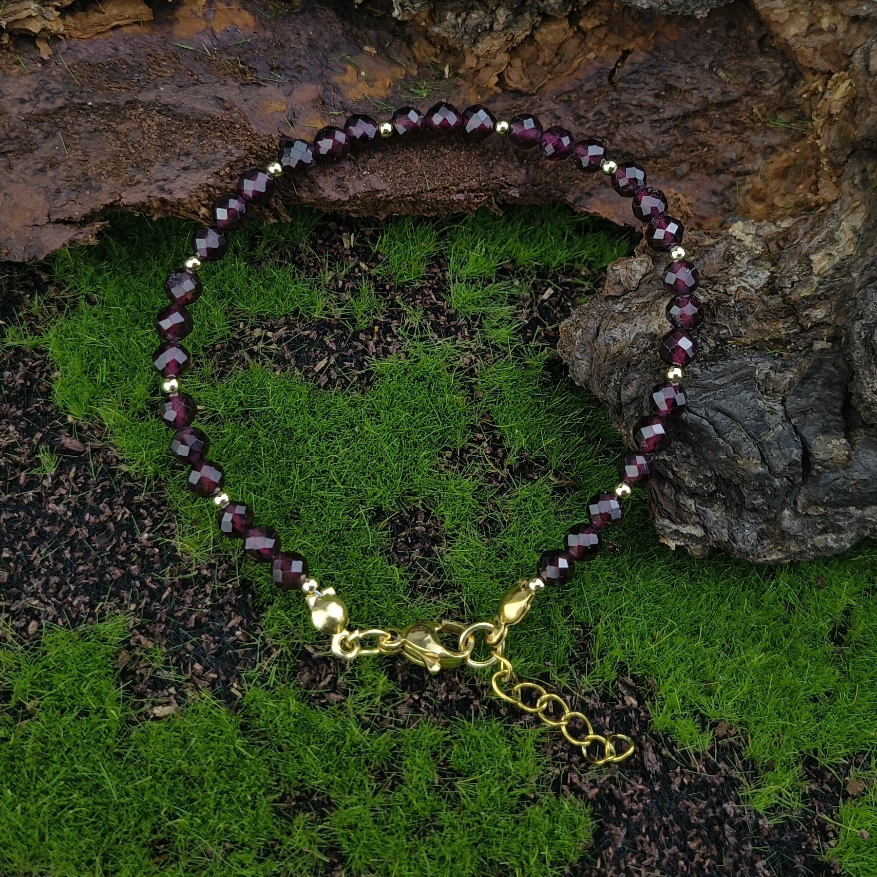 Bransoletka z Granatem na lince stalowej jubilerskiej. Zapięcie oraz inne elementy metalowe są ze stali szlachetnej pozłacanej. Bransoletka ma rozmiar ok 17 + 3cm przedłużki, dlatego łatwo dopasować ją do swojego nadgarstka. Kamienie o pięknej barwie.