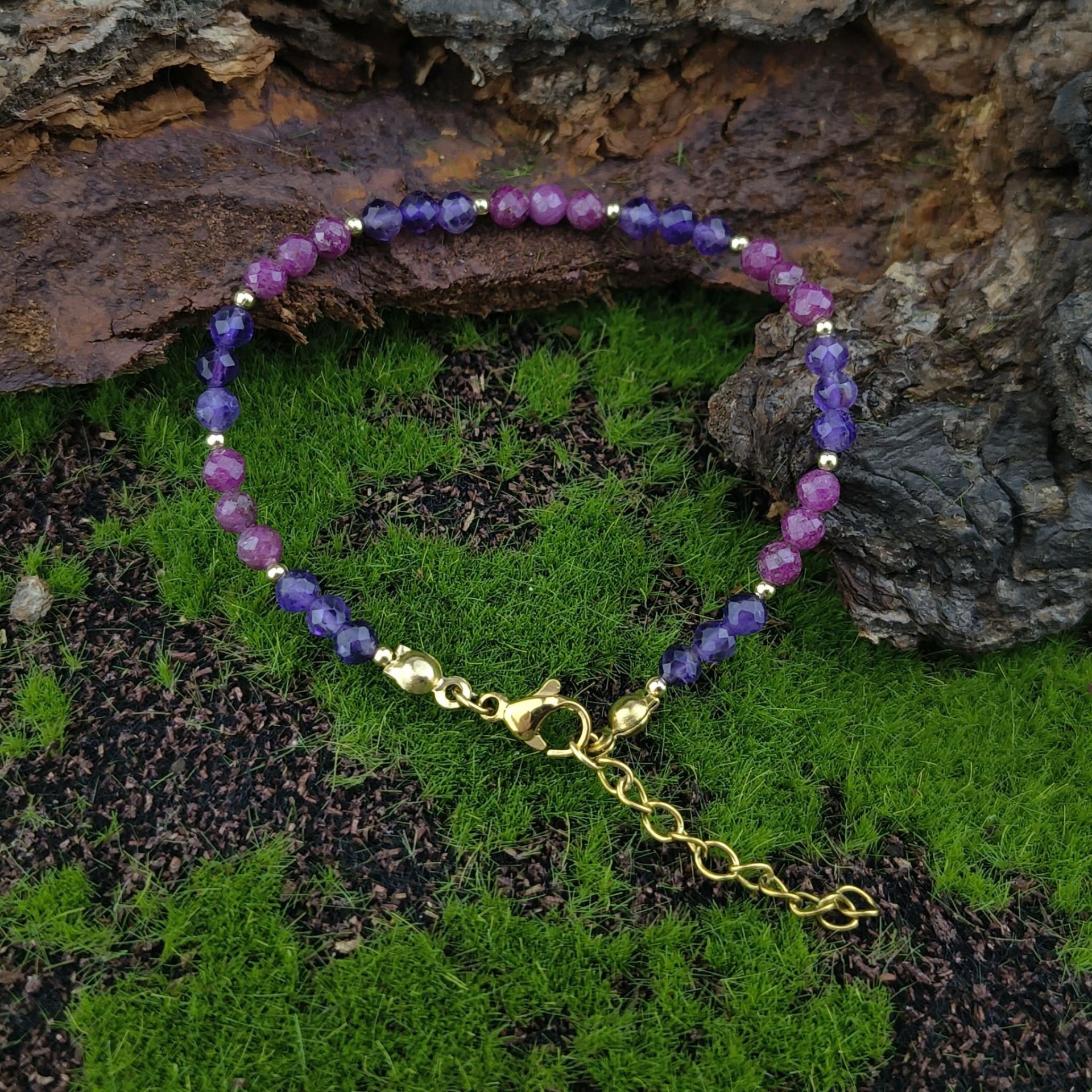 Bransoletka z Rubinem i Ametystem na lince stalowej jubilerskiej. Zapięcie oraz inne elementy metalowe są ze stali szlachetnej pozłacanej. Bransoletka ma rozmiar ok 17 + 3cm przedłużki, dlatego łatwo dopasować ją do swojego nadgarstka. Kamienie o pięknej barwie.