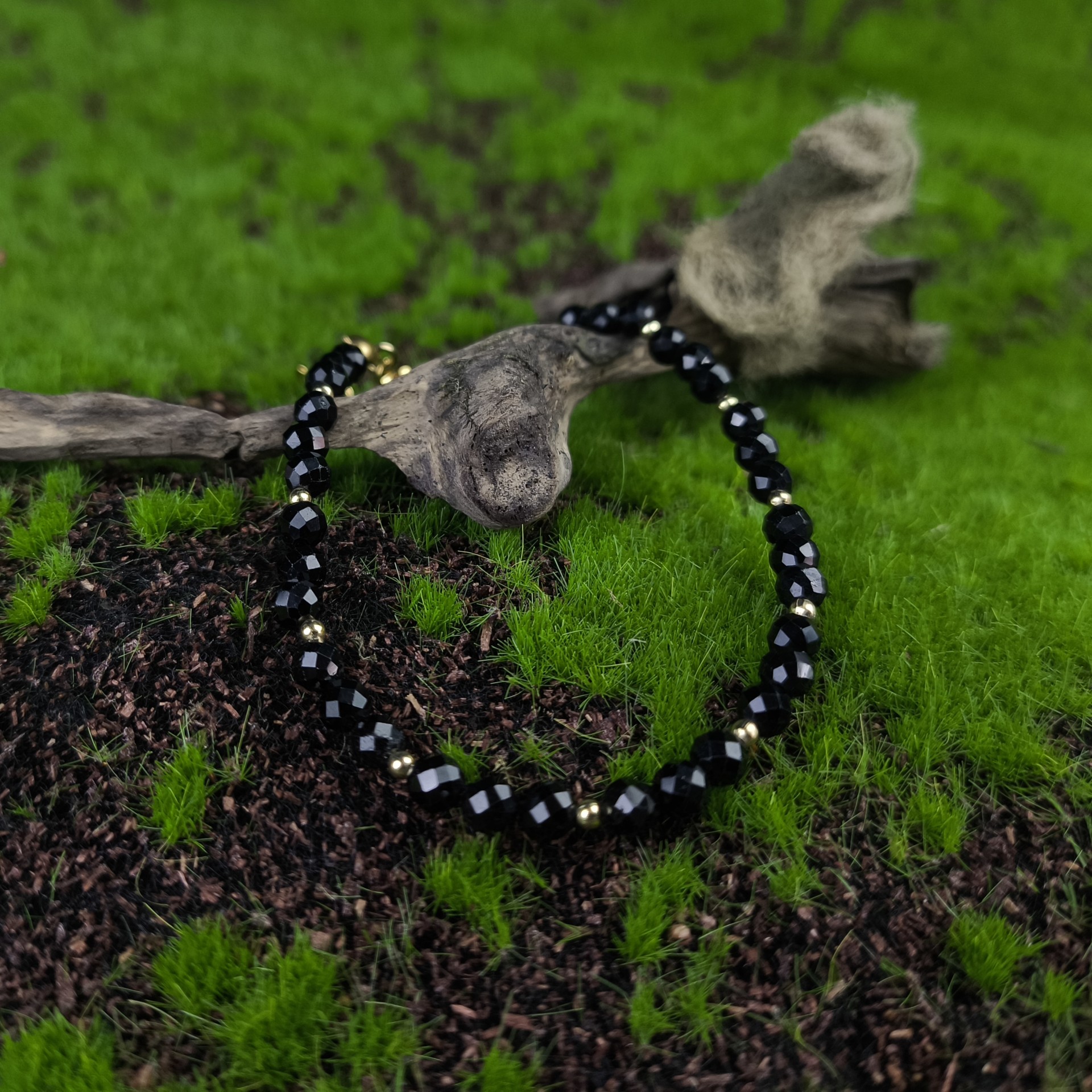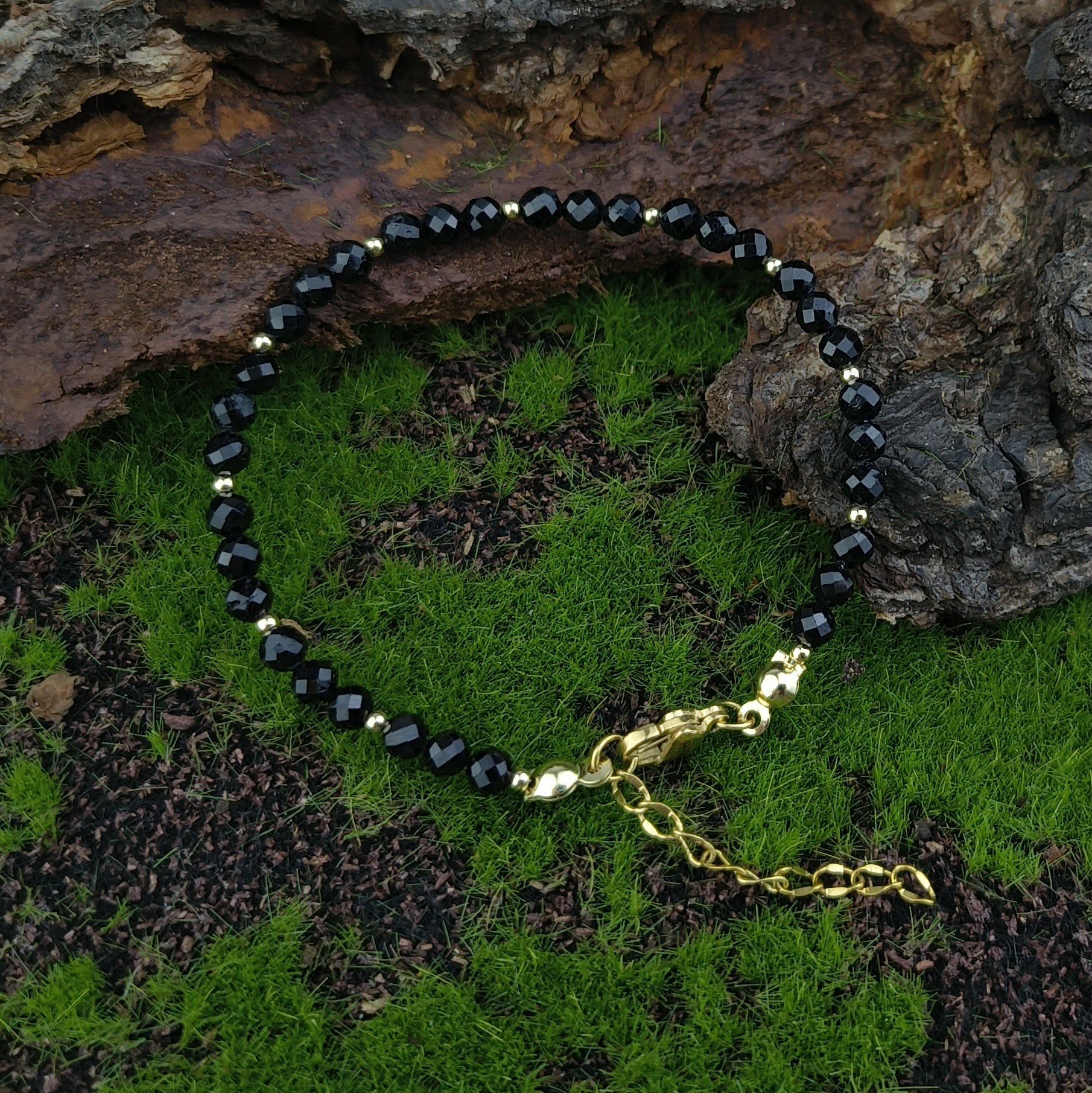 Bransoletka z czarnym Turmalinem na lince stalowej jubilerskiej. Zapięcie oraz inne elementy metalowe są ze stali szlachetnej pozłacanej. Bransoletka ma rozmiar ok 17 + 3cm przedłużki, dlatego łatwo dopasować ją do swojego nadgarstka.