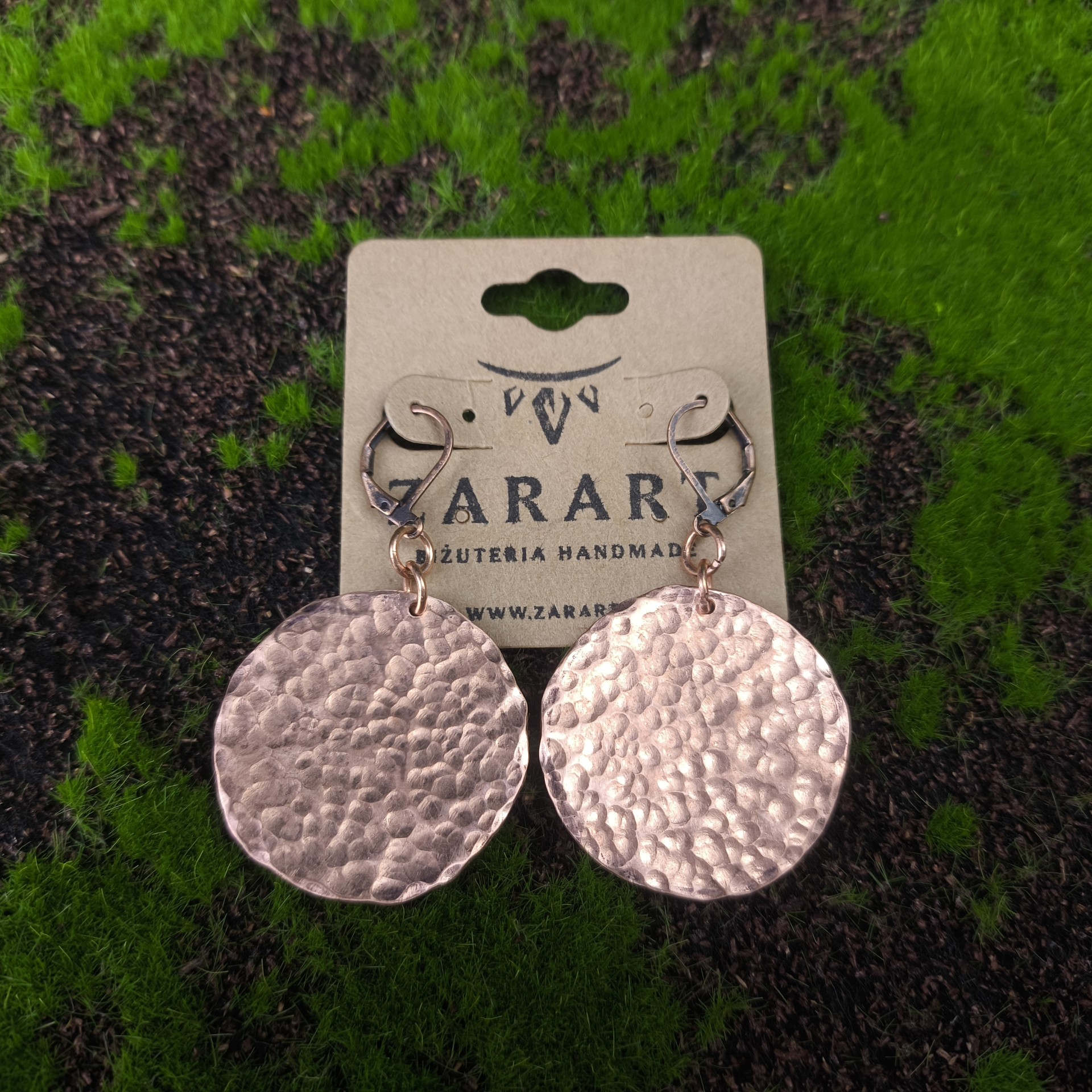 Ręcznie tworzone kolczyki miedziane duże koła. Zawieszone na biglach angielskich z mosiądzu. Wymiary ok. 3 cm.