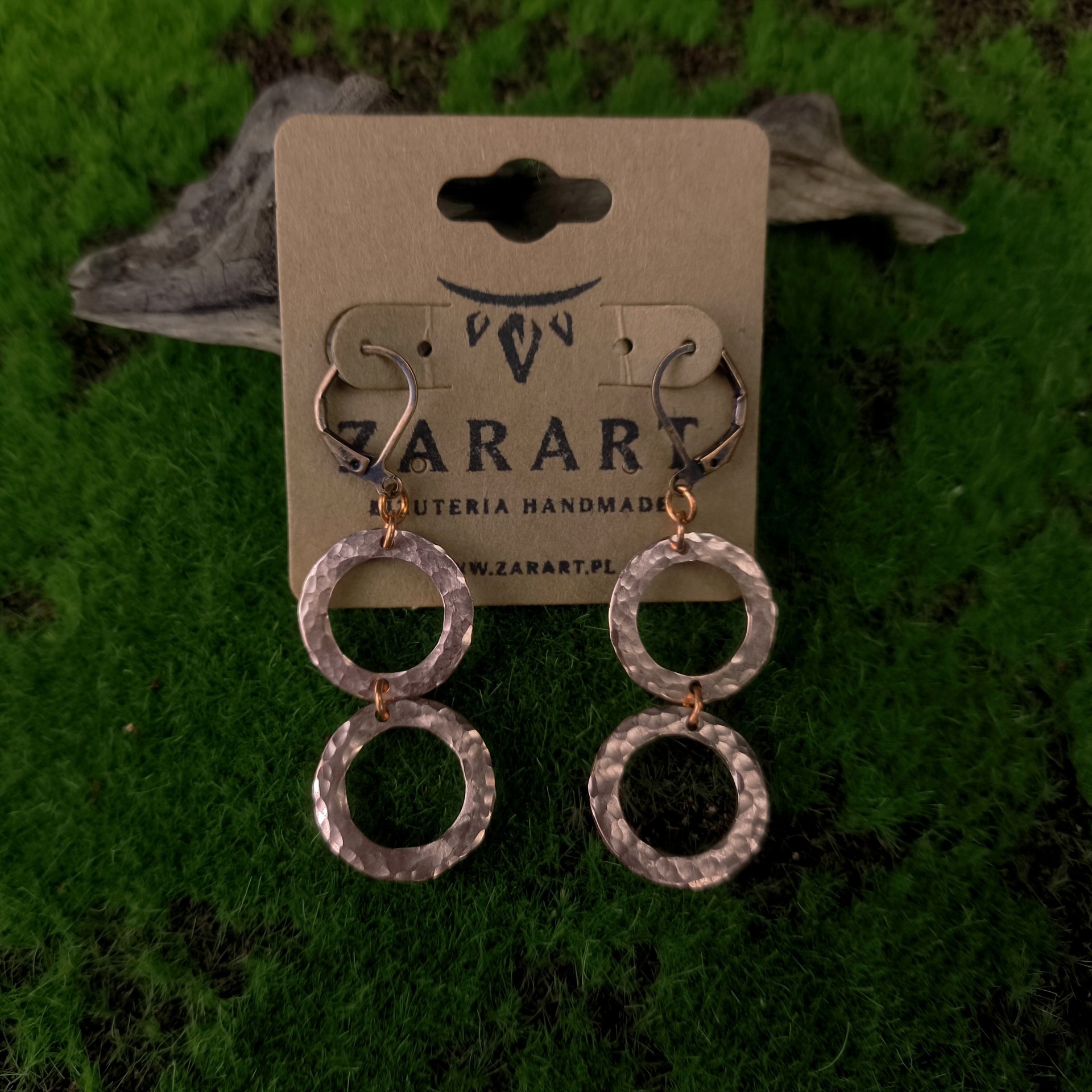 Kolczyki miedziane. Ręcznie wykonane. Koła młotkowane. Na zapięciach typu bigle angielskie z mosiądzu.