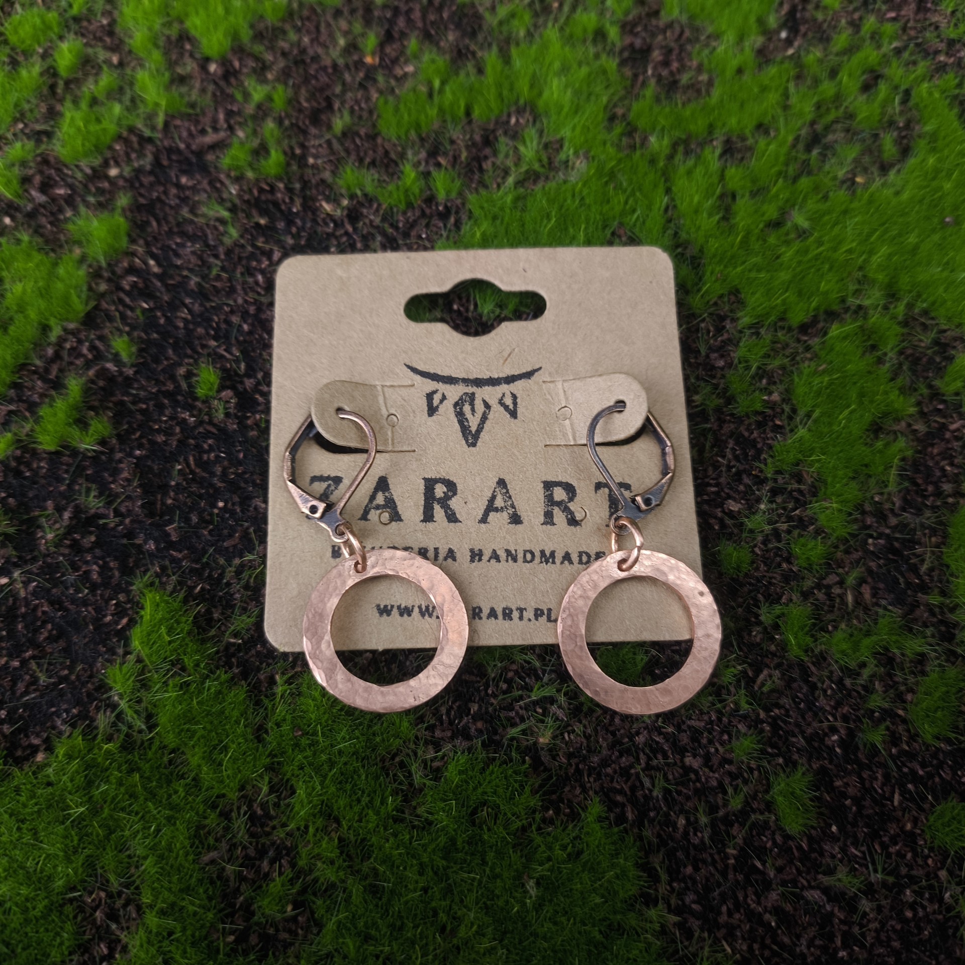 Ręcznie tworzone kolczyki miedziane koła. Zawieszone na biglach angielskich z mosiądzu. Wymiary 1,1cm.