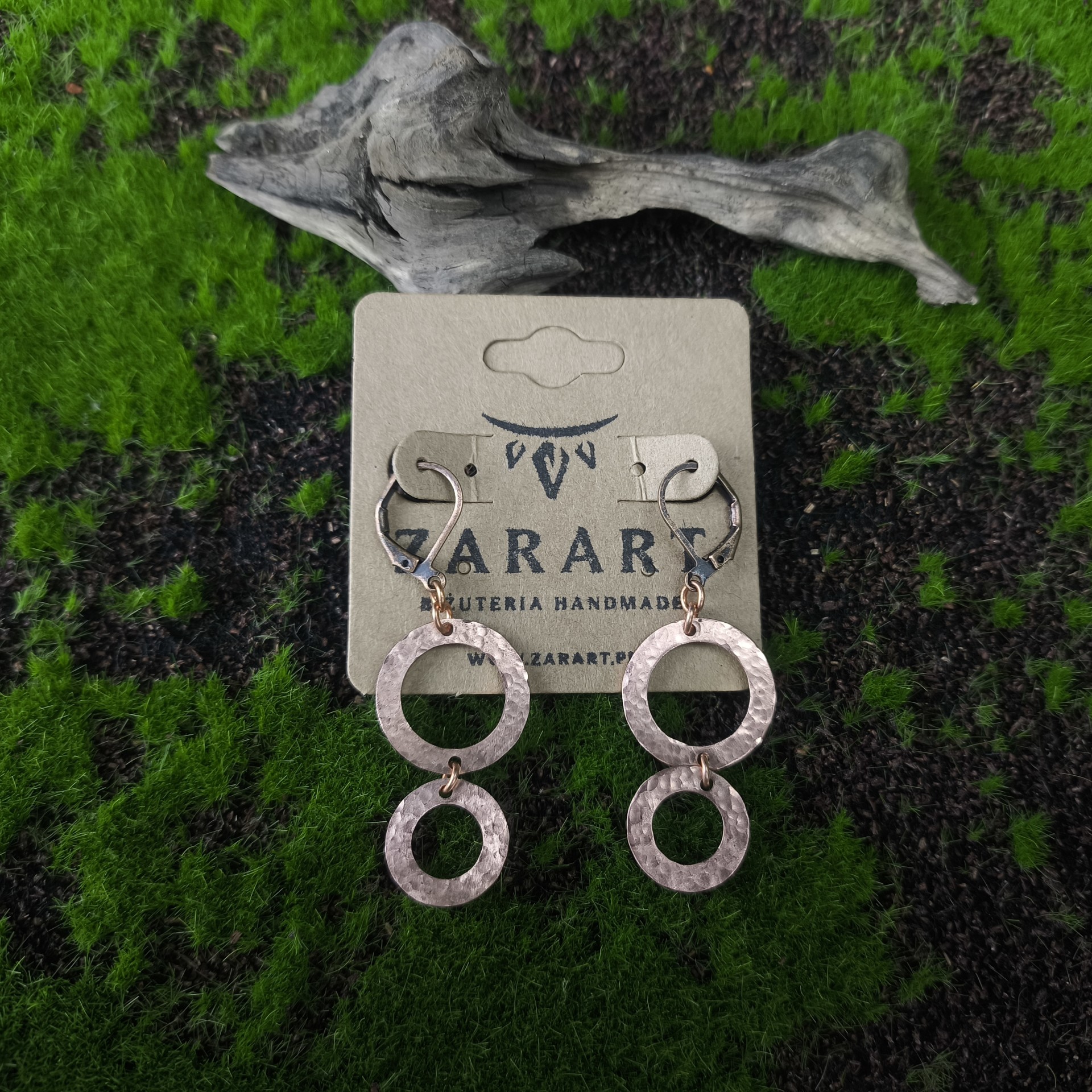 Ręcznie tworzone kolczyki miedziane podwójne koła. Zawieszone na biglach angielskich z mosiądzu. Wymiary 3,3x1,8cm.