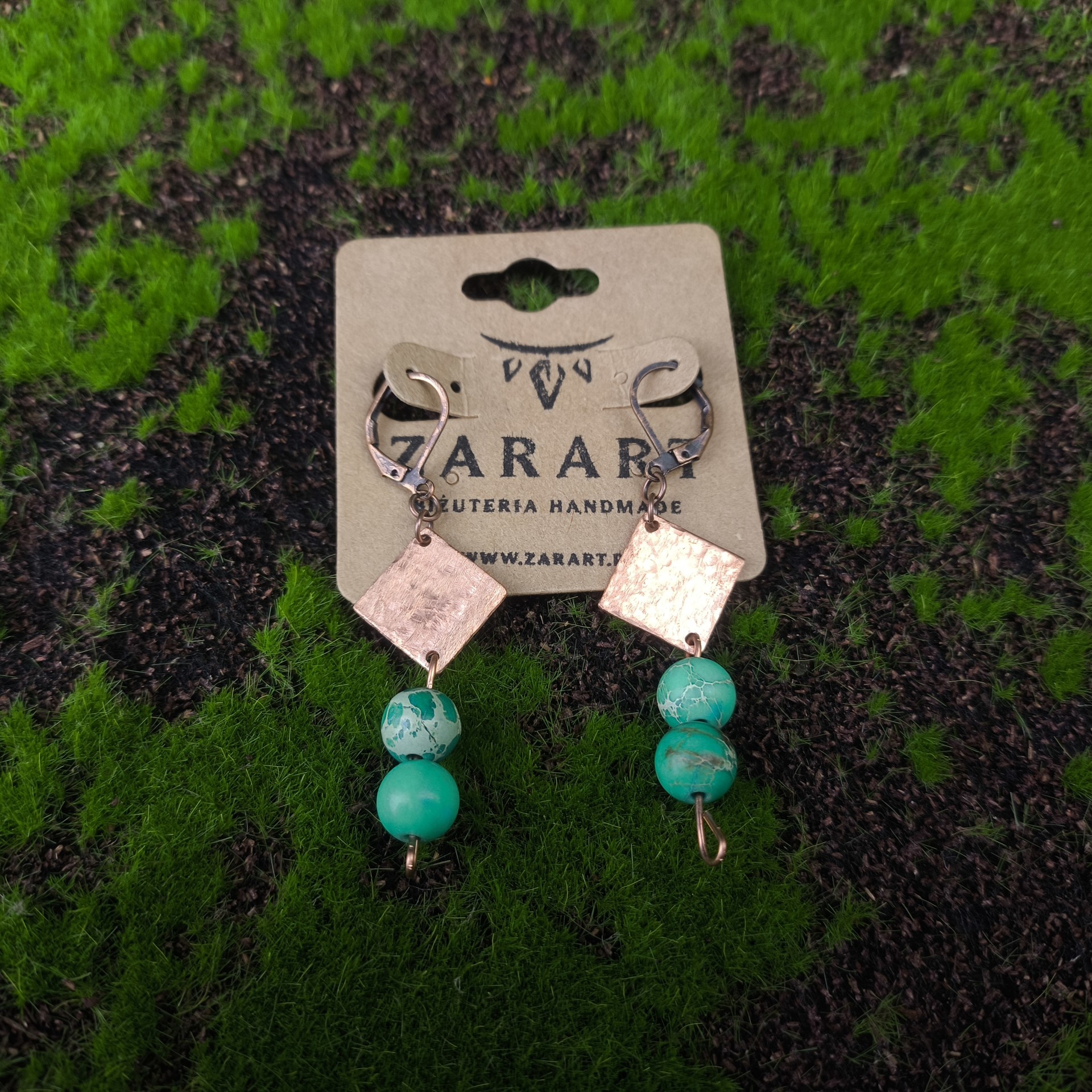 Ręcznie tworzone kolczyki miedziane odwrócone kwadraty z Jaspisami o ciekawym kolorze. Zawieszone na biglach angielskich z mosiądzu. Wymiary 4x1,7 cm.