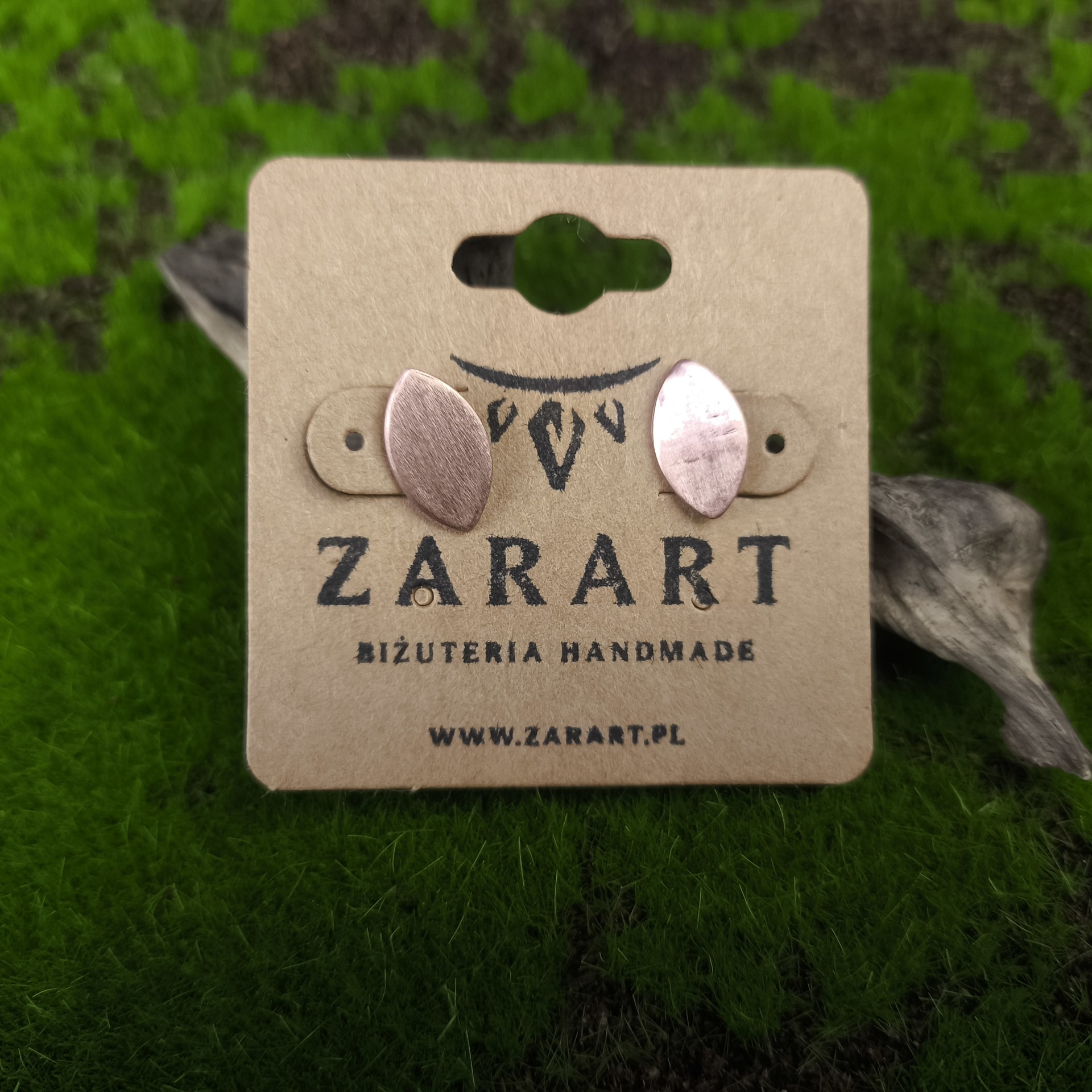 Ręcznie tworzone kolczyki miedziane w kształcie łezki. Na sztyftach ze srebra. Wymiary ok. 1,5x0,8 cm.