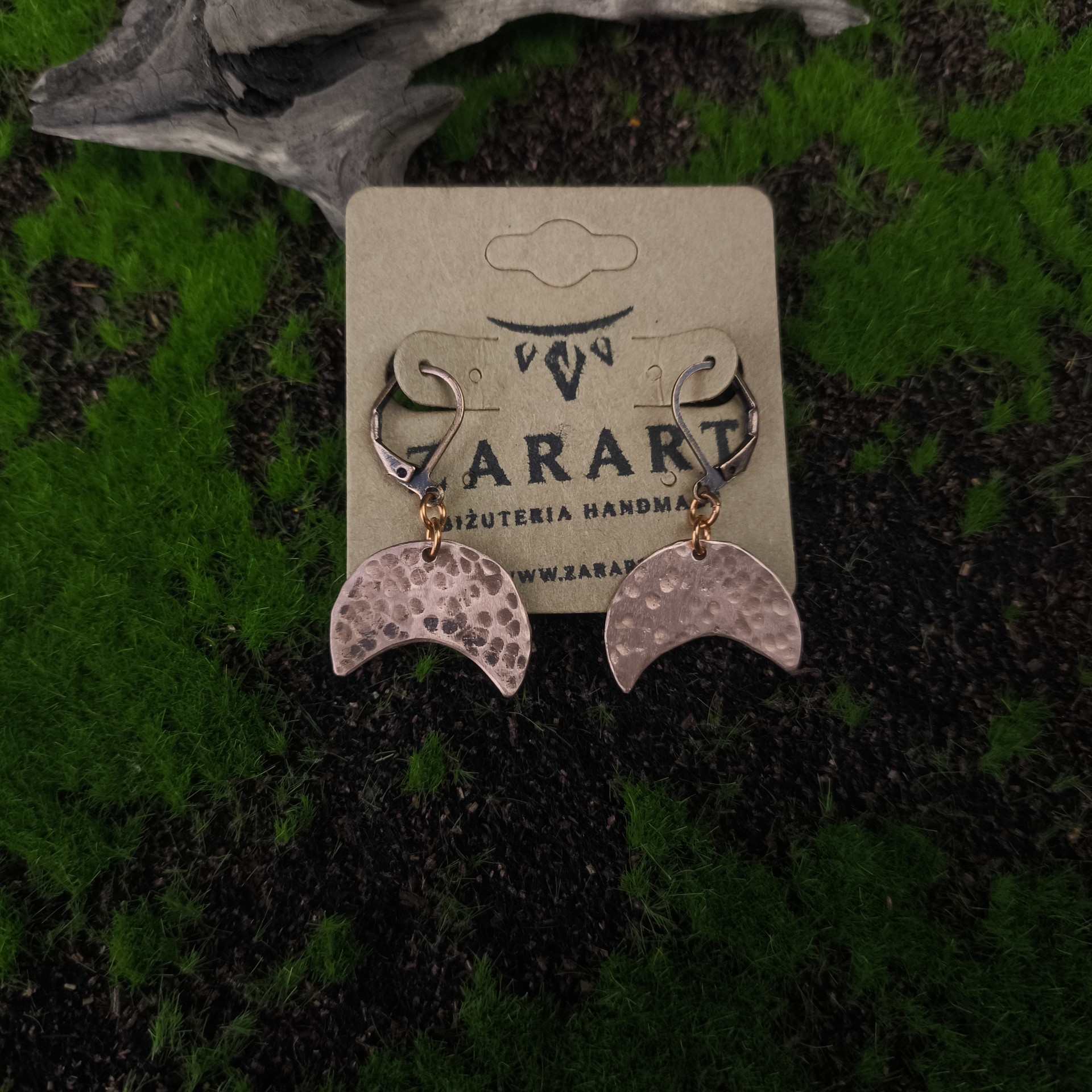 Ręcznie tworzone kolczyki miedziane w kształcie lunuli. Fakturowane oraz zawieszone na biglach angielskich z mosiądzu.