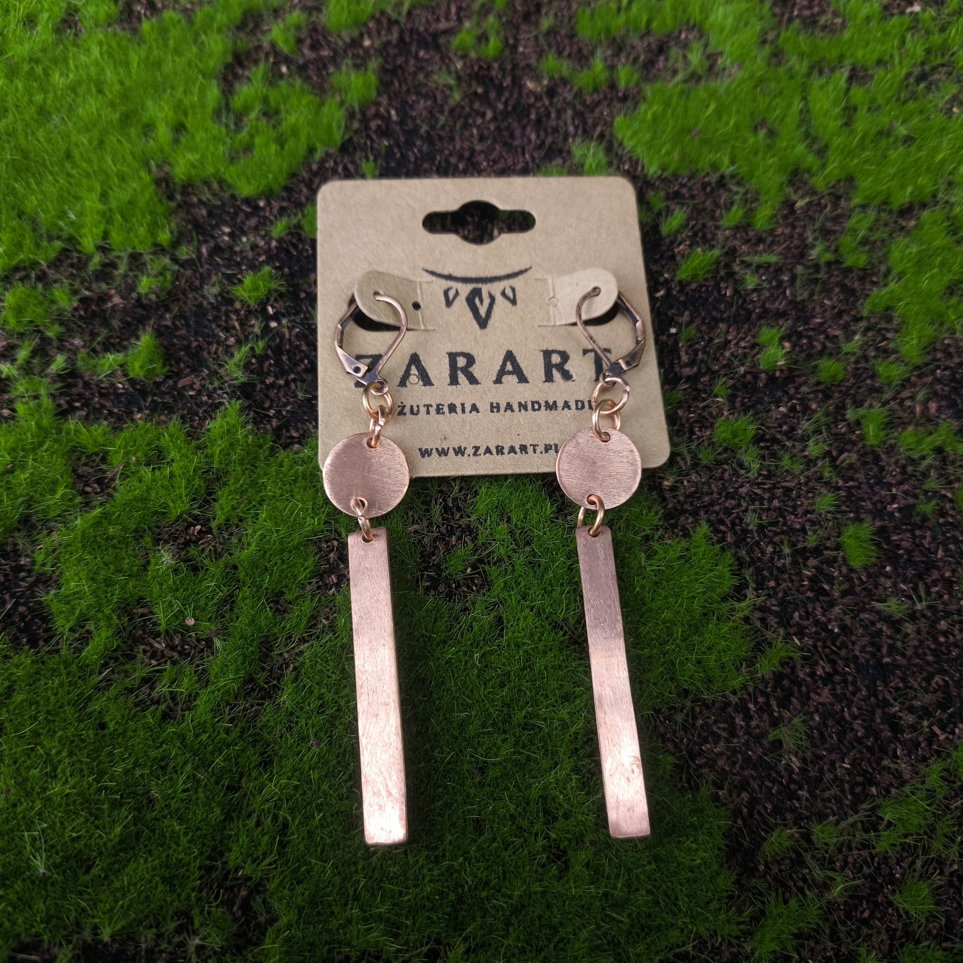 Ręcznie tworzone kolczyki miedziane długie prostokąty z kołami. Zawieszone na biglach angielskich z mosiądzu. Wymiary 5x0,5cm.