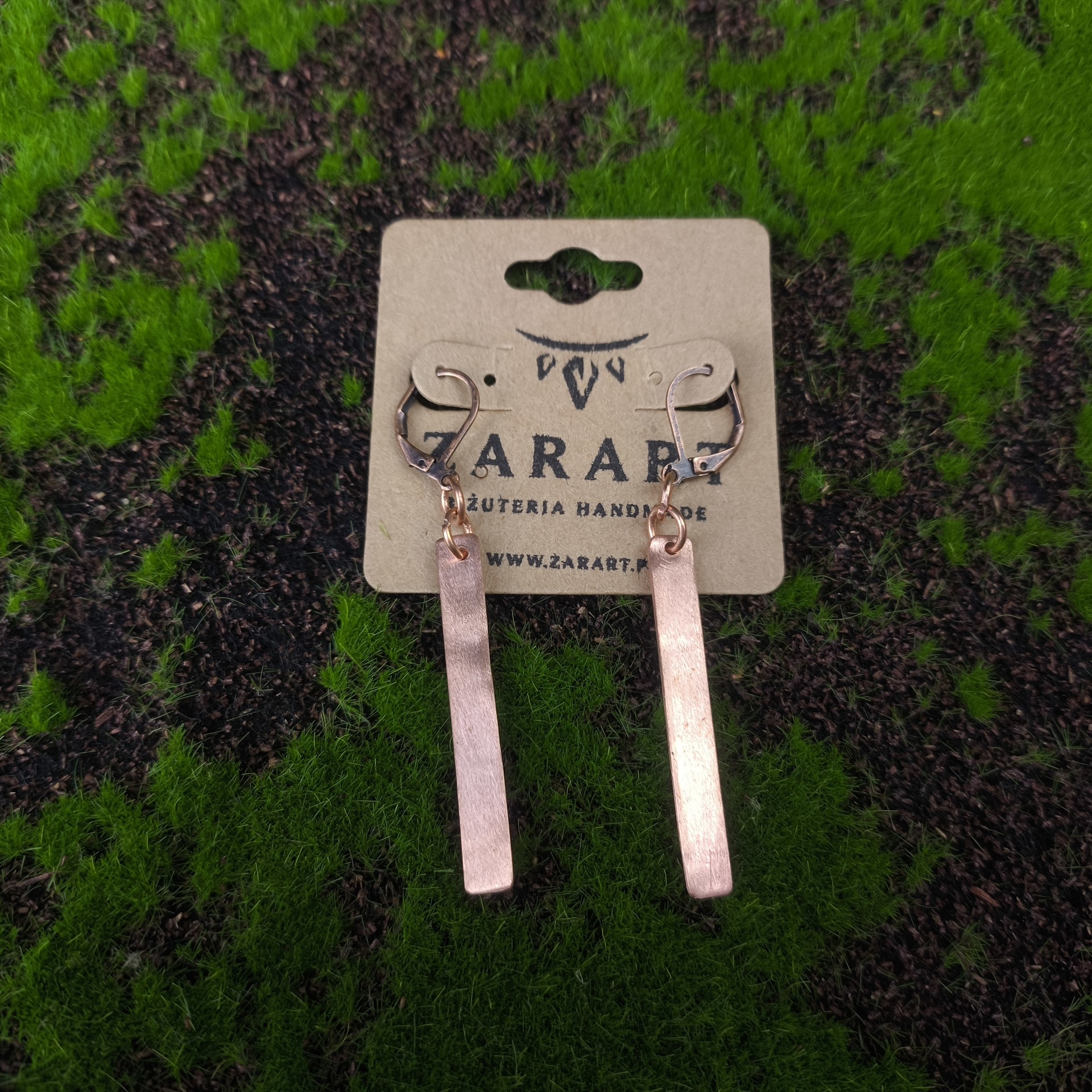 Ręcznie tworzone kolczyki miedziane długie prostokąty. Zawieszone na biglach angielskich z mosiądzu. Wymiary 4x0,5 cm.