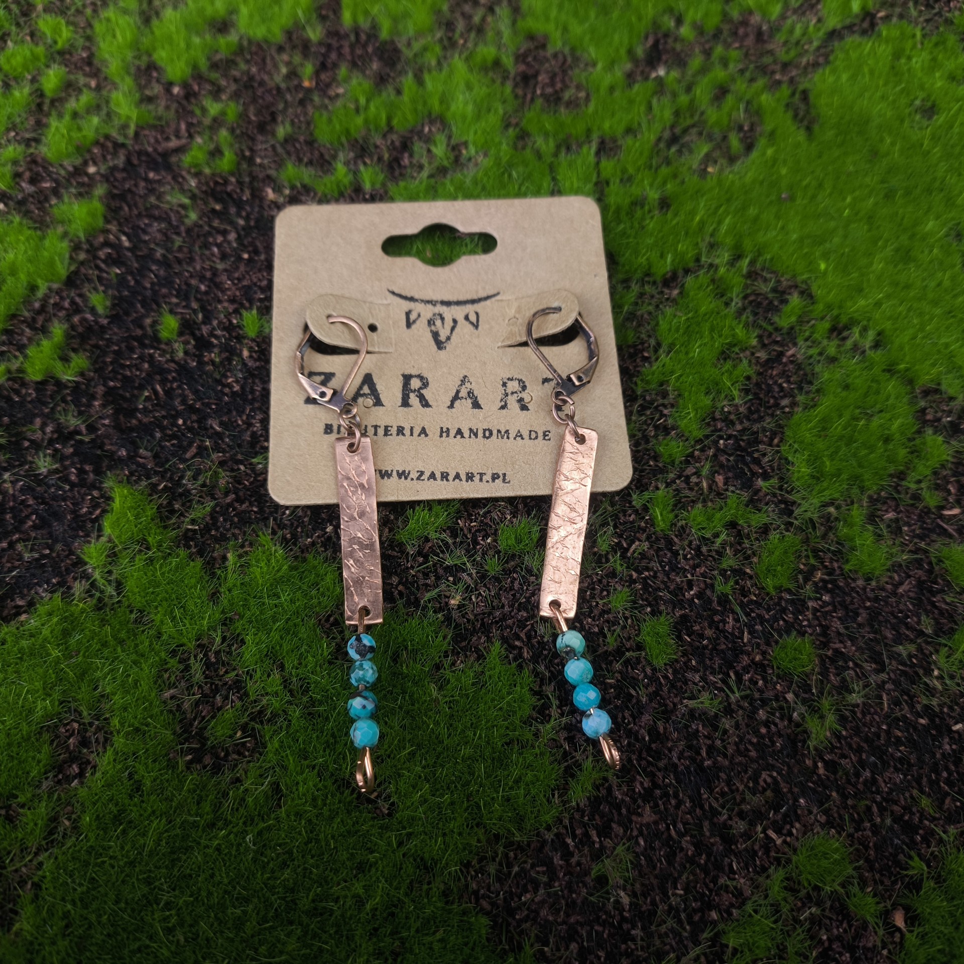Ręcznie tworzone kolczyki miedziane długie prostokąty z Turkusami. Zawieszone na biglach angielskich z mosiądzu. Wymiary 4,5x0,5 cm.