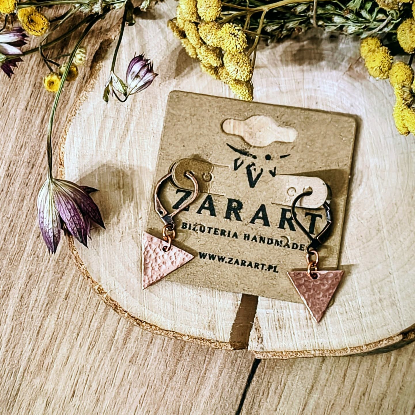 Kolczyki miedziane. Ręcznie wykonane. W kształcie trójkątów. Na zapięciach typu bigle angielskie z mosiądzu.