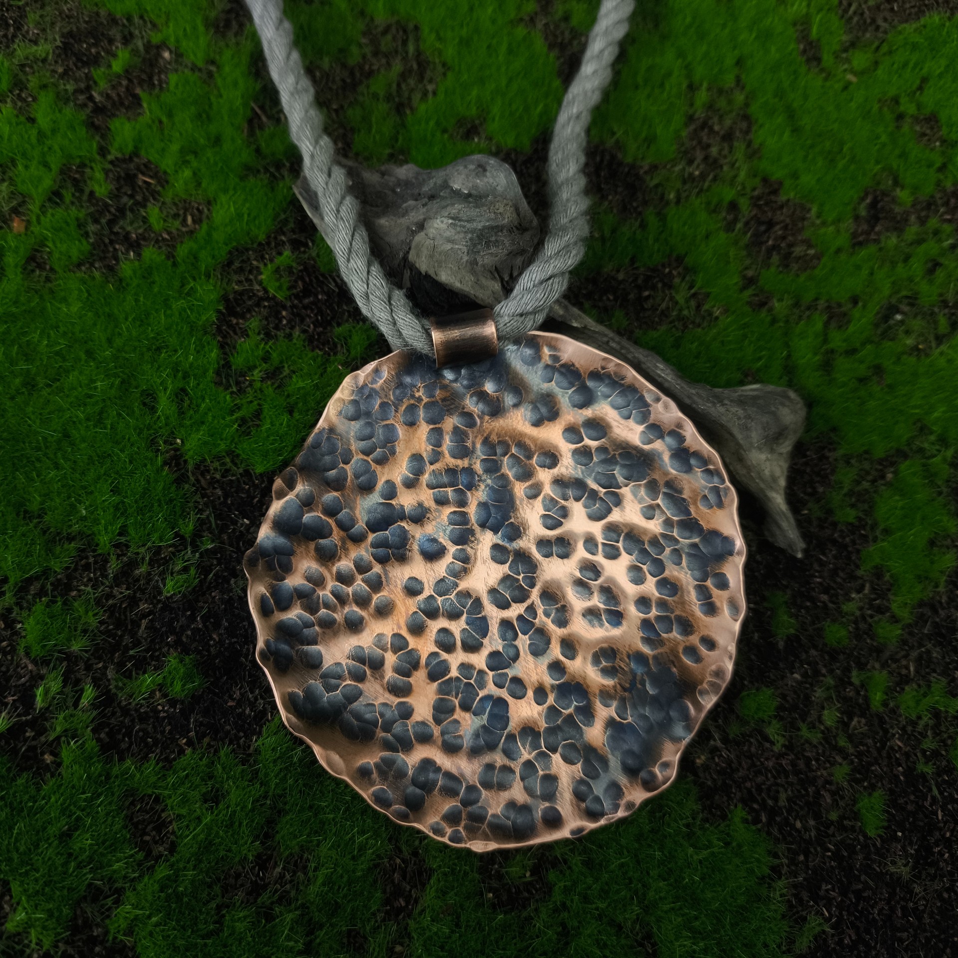 Naszyjnik miedziany w kształcie koła. Młotkowany, lekko wklęsły. Wielkość ok 7,5cm. Na pięknym bawełnianym sznurku.