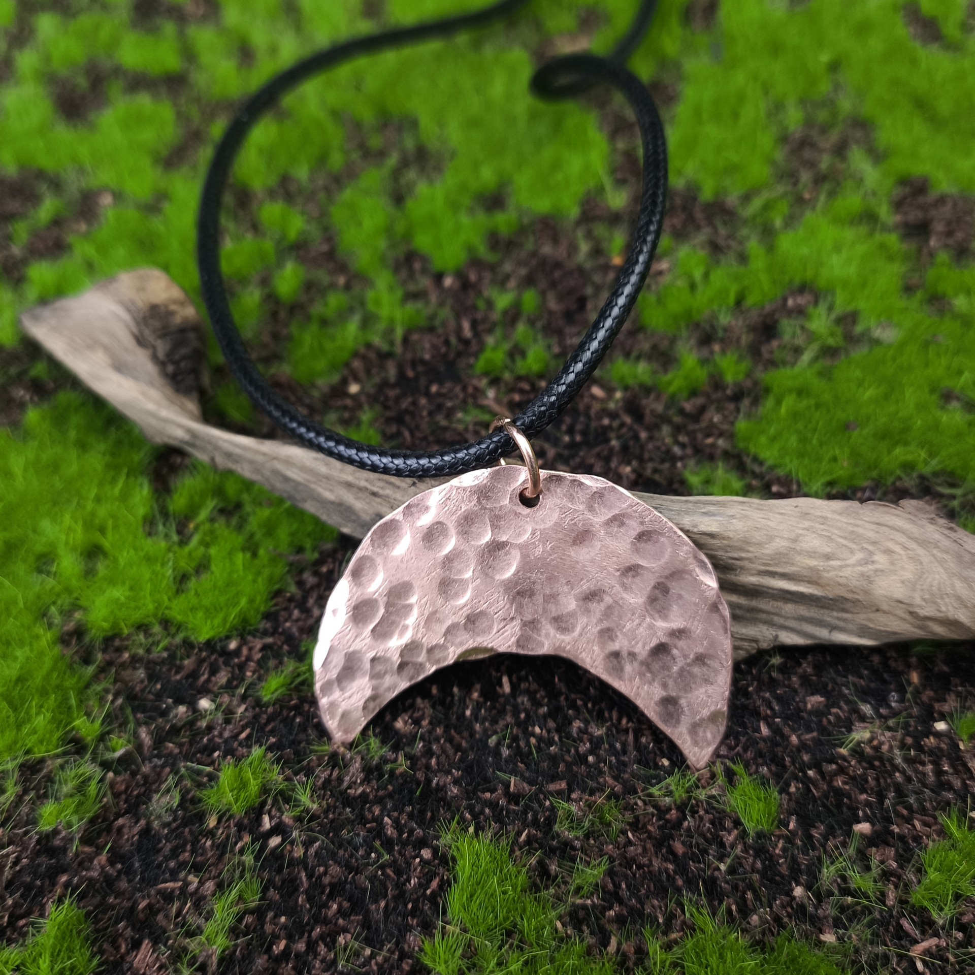 Naszyjnik miedziany w kształcie księżyca. Na regulowanym pasku jubilerskim max do 40 cm. Rozmiar ok. 4x2,5cm.
