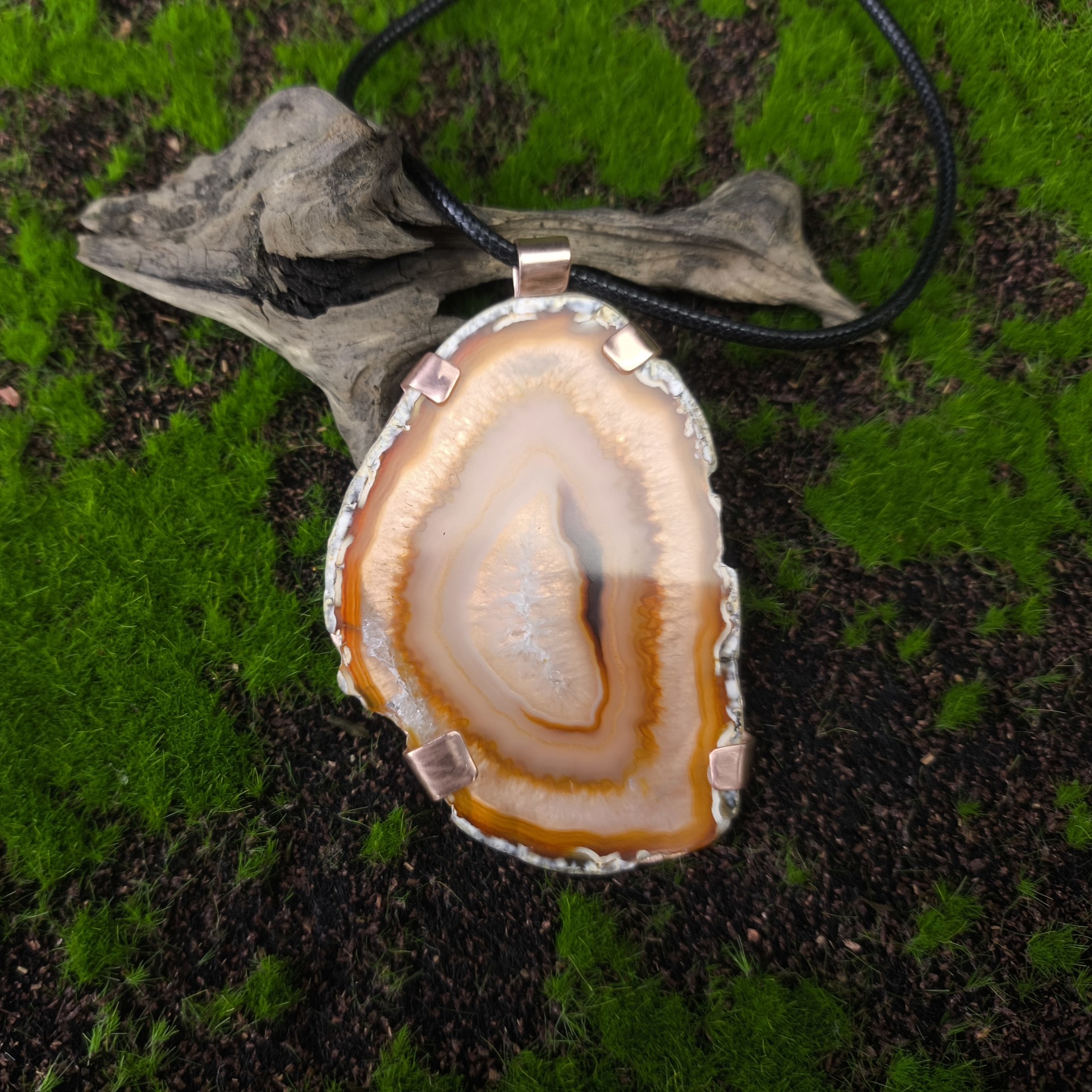 Naszyjnik miedziany z pięknym agatem. Kamień w delikatnej oprawie z miedzi. Na sznurku jubilerskim do max 40cm. Rozmiar ok. 7x4,8cm.