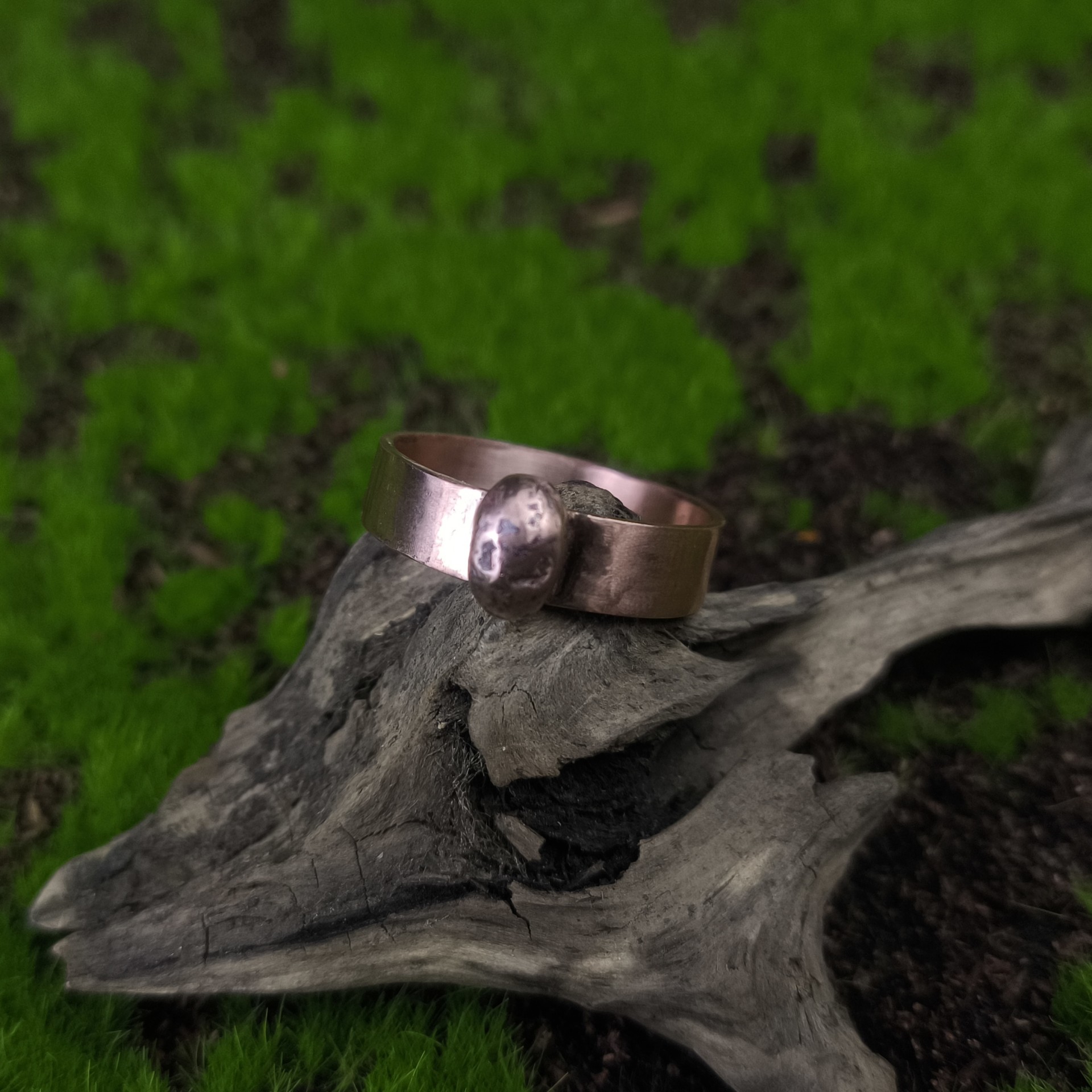 Pierścień miedziany, ręcznie wykonany. Dodatkowym elementem ozdobnym jest miedziana "kulka". Pierścień o rozmiarze ok 23,5.