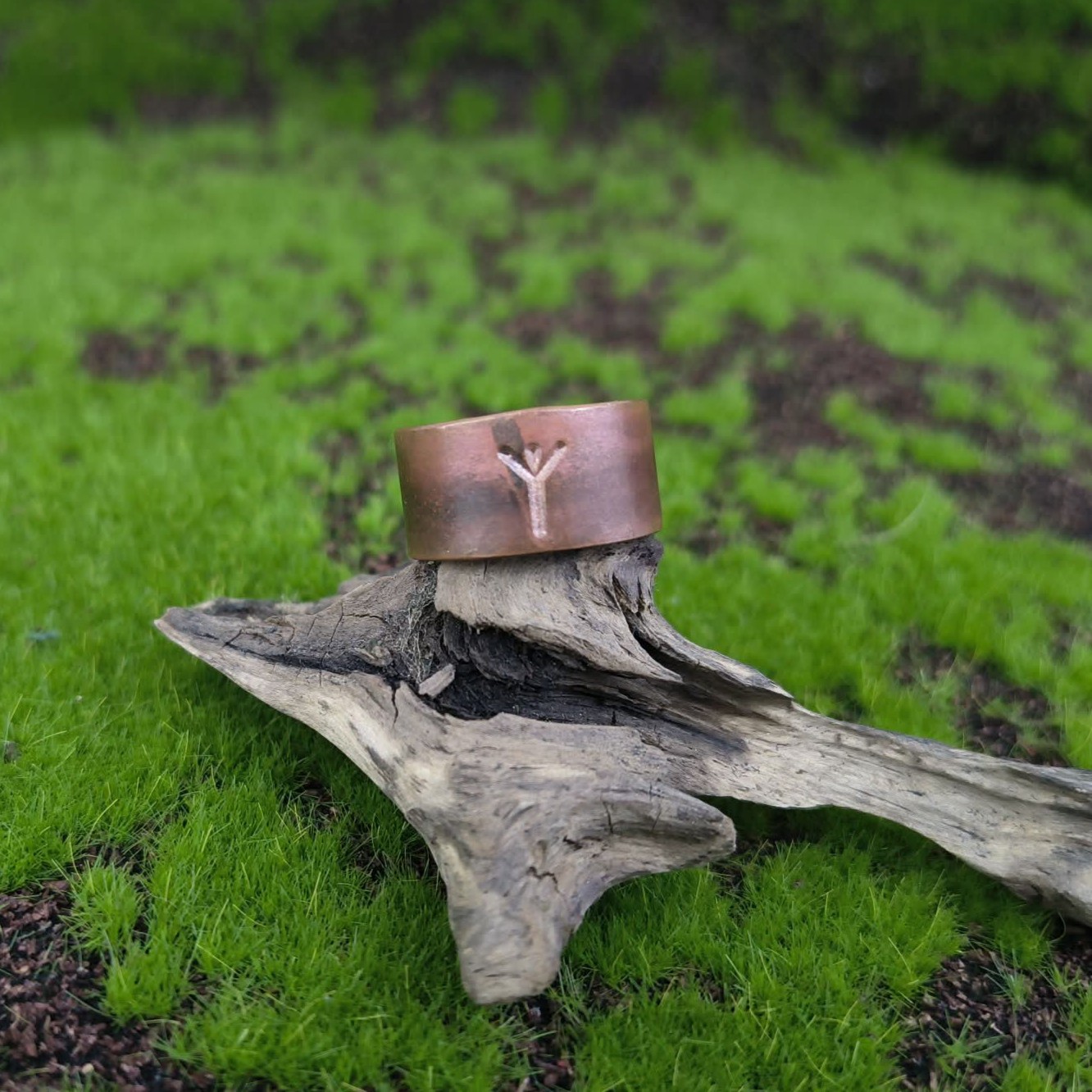 Pierścień miedziany o czerwonej barwie - powstającej dzięki wypalaniu miedzi. Z wybitą runą Algiz Pierścień o rozmiarze ok 13-20.