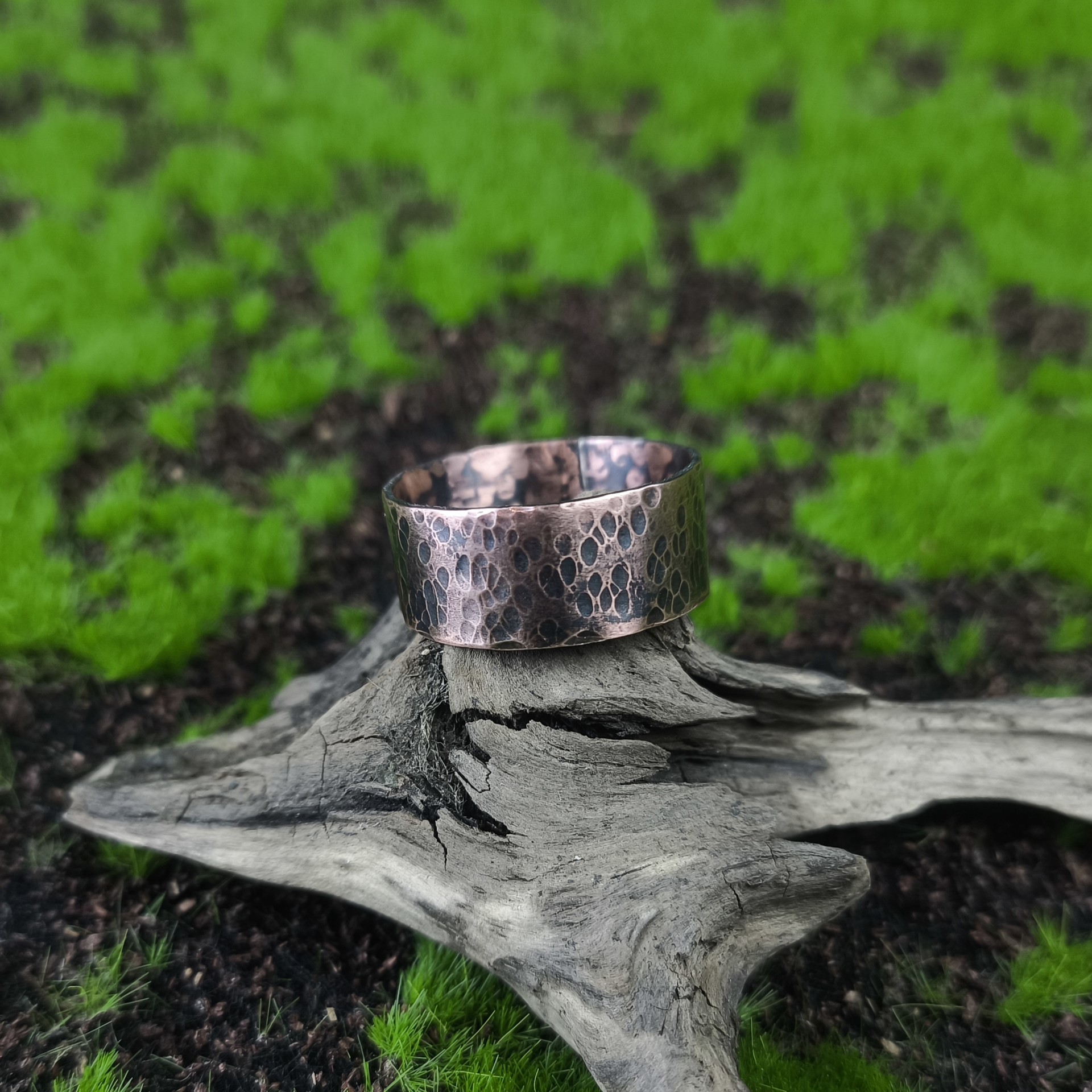 Pierścień miedziany, ręcznie wykonany. Młotkowany oraz oksydowany. Pierścień o rozmiarze ok 19.