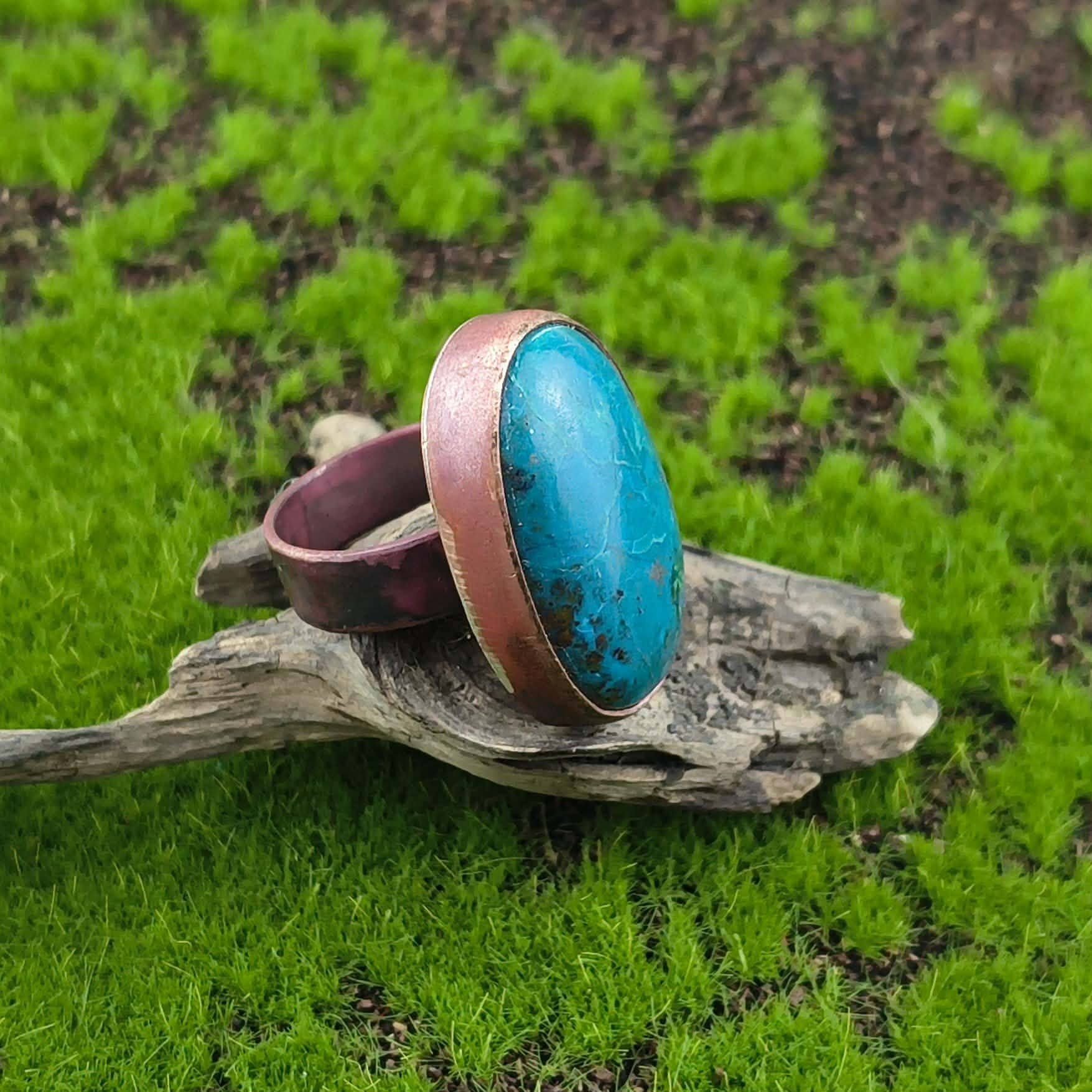 Pierścionek miedziany z chryzokolą. Piękny duży kamień o turkusowo-niebieskim kolorze. Ręcznie robiony. Rozmiar pierścionka to ok. 18.