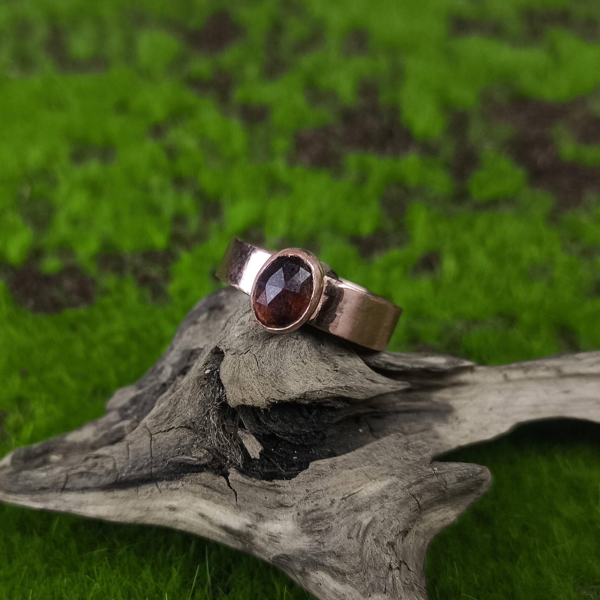 Pierścionek miedziany z granatem. Ręcznie robiony, unikatowy wzór. Rozmiar pierścionka to ok. 17.