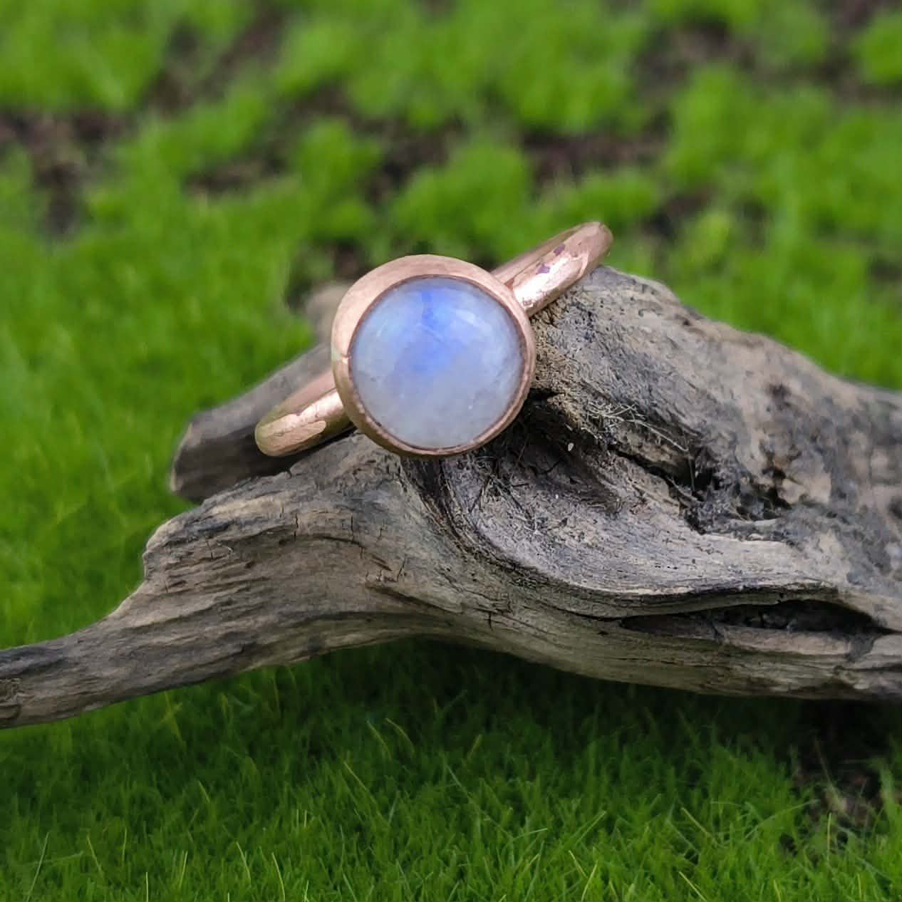 Pierścionek miedziany z kamieniem księżycowym. Piękna delikatna forma pierścionka i ciekawie mieniący się kamień. Ręcznie robiony. Rozmiar pierścionka to ok. 12.