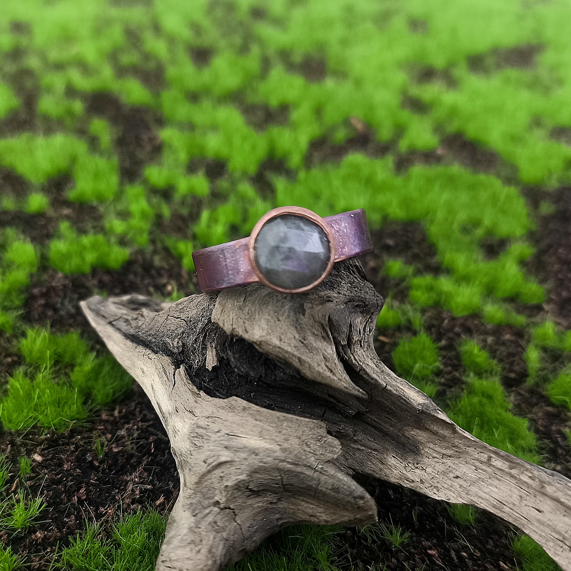 Pierścionek miedziany z labradorytem. Fasertowany kamień o fioletowych przebłyskach. Ręcznie robiony. Rozmiar pierścionka to ok. 21.
