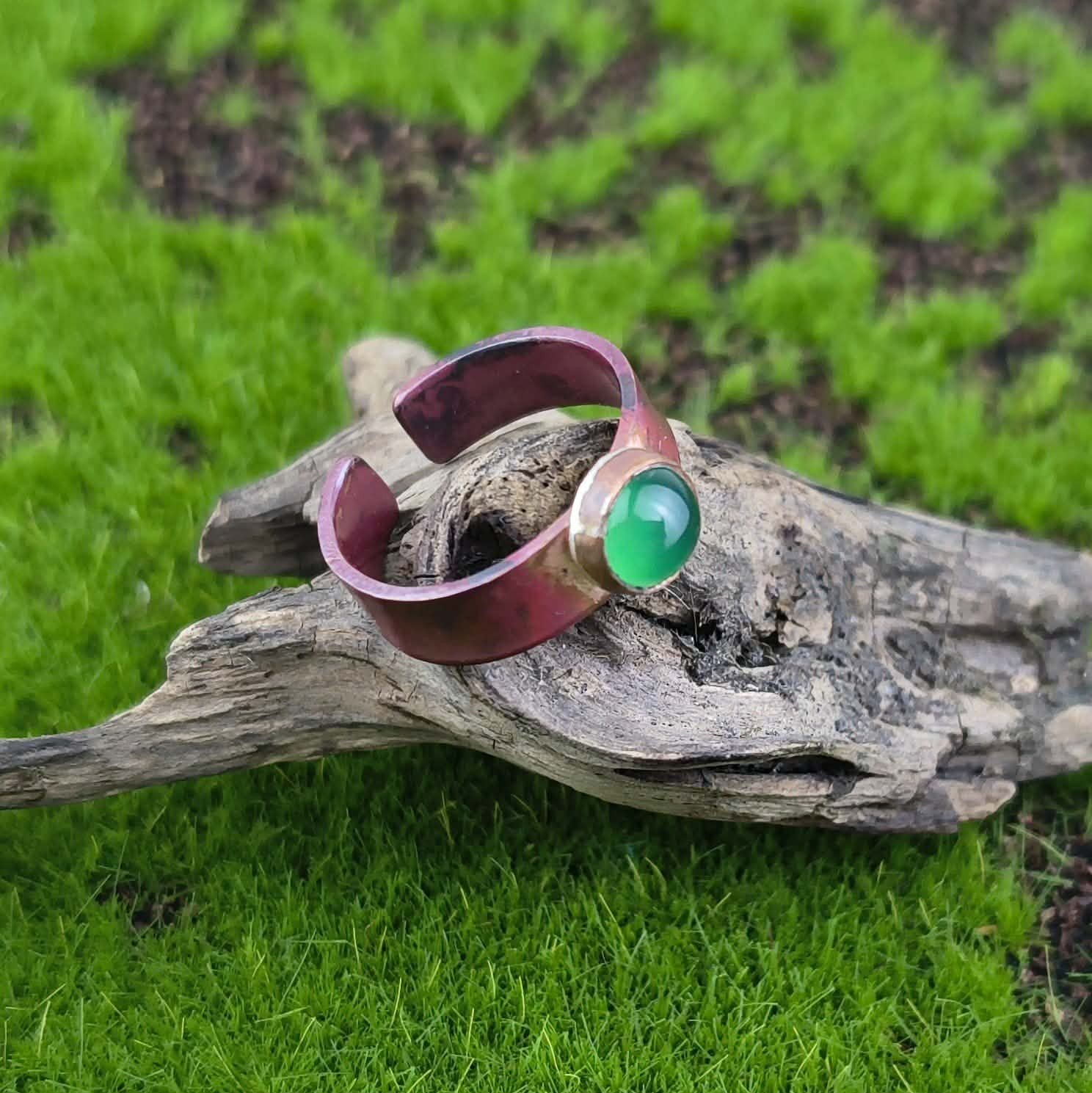 Pierścionek miedziany z zielonym onyksem. Piękna delikatna forma z wypalaną na czerwono miedzią. Ręcznie robiony. Rozmiar pierścionka to ok. 21.