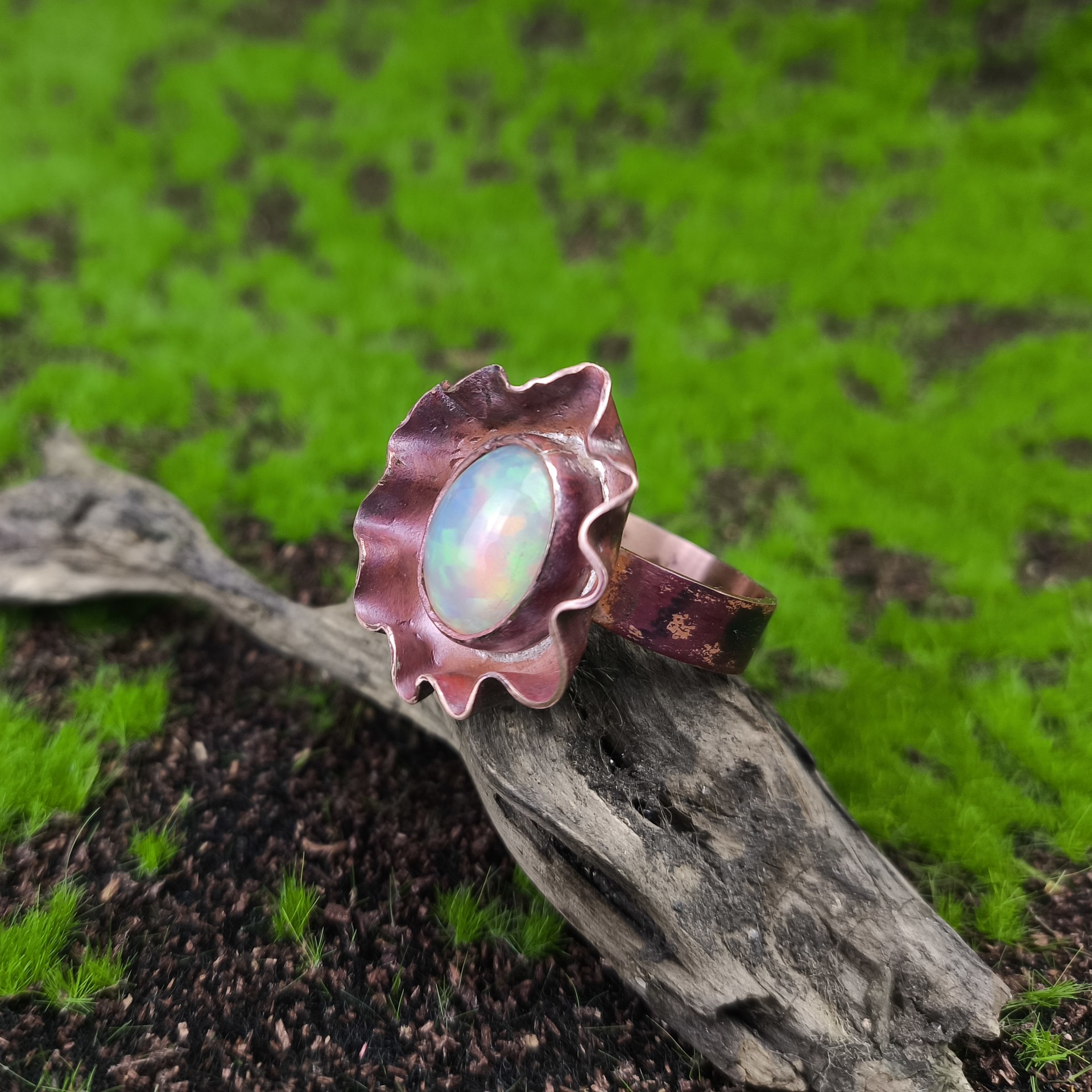 Pierścionek miedziany z pięknym opalem etiopskim. Pierścionek ręcznie robiony o rozmiarze ok. 18. Sam kamień ma ok 3,9 karata. Ma przepiękne przebłyski, na żywo wygląda jeszcze lepiej niż na zdjęciach.