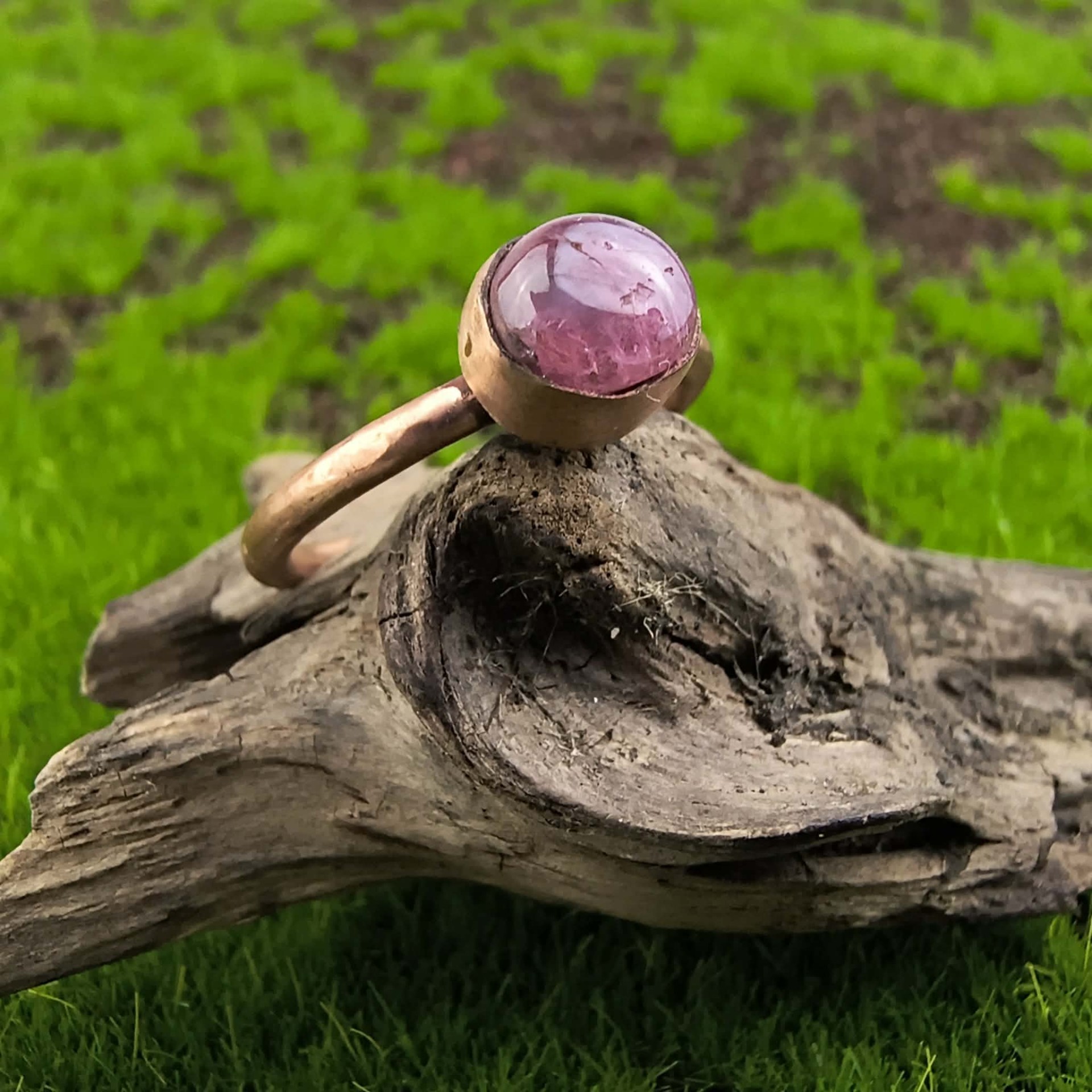 Pierścionek miedziany z różowym szafirem. Piękna delikatna forma pierścionka i ciekawy kamień o pięknej barwie. Ręcznie robiony. Rozmiar pierścionka to ok. 13.