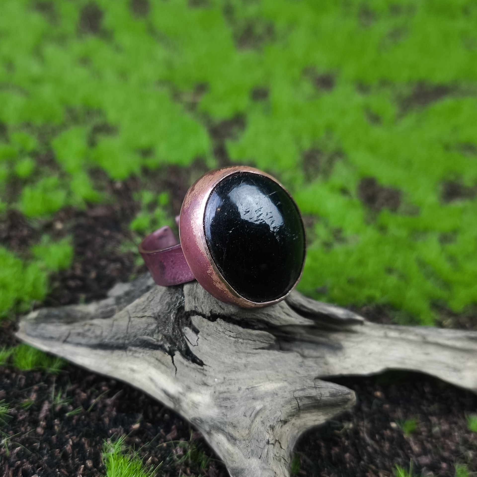 Pierścionek miedziany z pięknym czarnym turmalinem. Piękny, stylowy i z charakterem. Pierścionek ręcznie robiony o rozmiarze regulowanym 16-22.